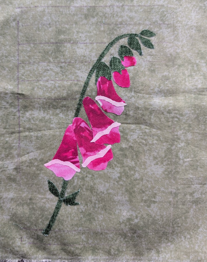 I decided to do one of a foxglove, they’re a lovely flower, I love seeing them both in the garden where they happily self seed, or in the wild. Rebecca from Featherstitch House has done a gorgeous design using raw edge applique and bondaweb.