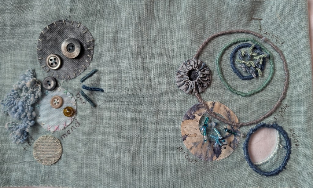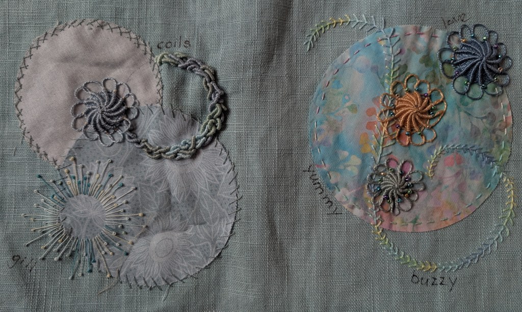 The other side of this strip with the other hole has a few more buttons and a spare Suffolk puff. Mend was an early word, you can just see behind the three circles is a raw edge. two pieces of linen weren’t quite big enough so I stitched the circles over the raw edges to join them together. Thr three circles on the right were for ‘ripple’, that’s wool that’s couched over. Twisted is a stitch which I can’t remember the name of but you basically do a line of stitches slipped on a needle before pulling it through to make a sticking up stitch!
