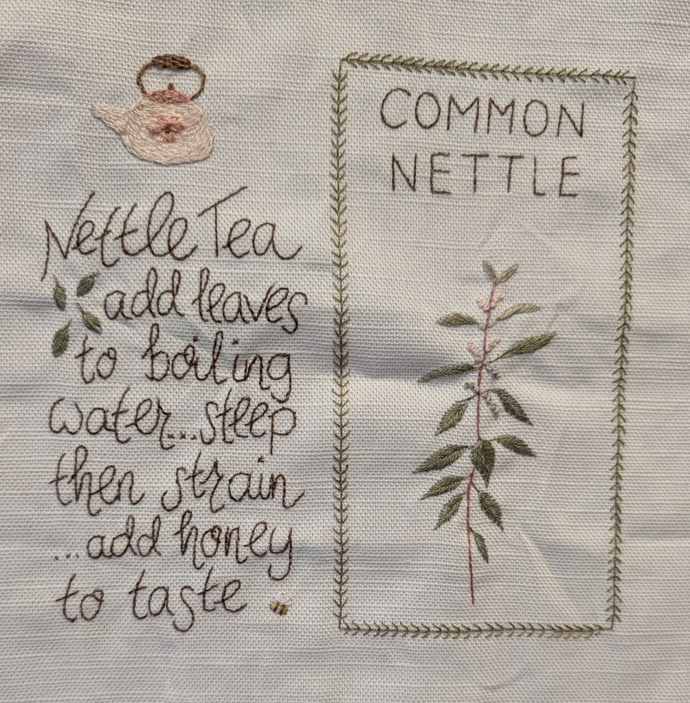 January’s page is nettle, so there’s a recipe for nettle tea, not that I fancy trying it! There’s lots of nettles on the back lane which is good as they’re an important food for caterpillers. The words are all stitched with back-stitch. The plant is a mixture of satin, fishbone and stem stitch with a few French knots.