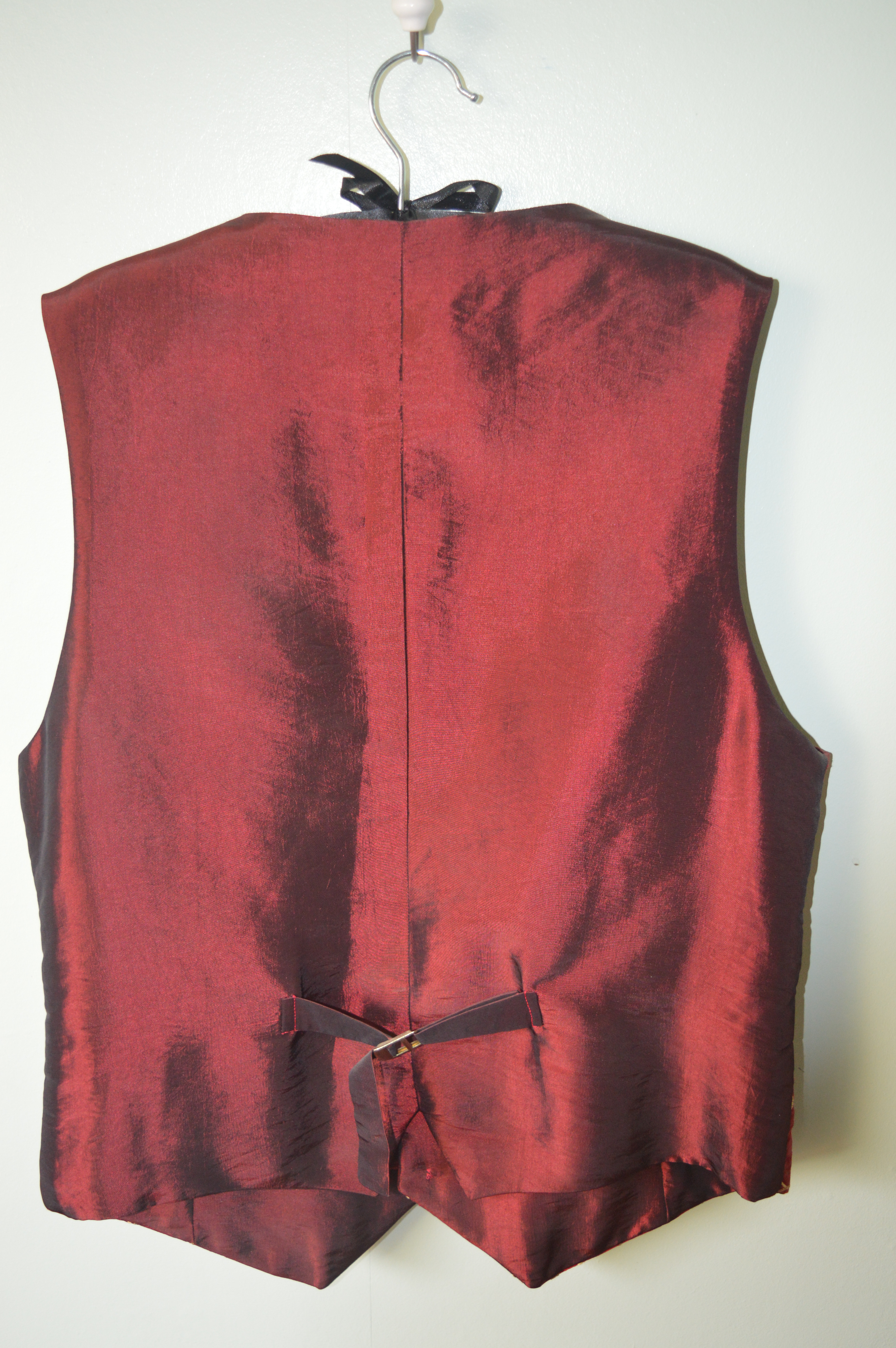 I interlined the waistcoats fronts with batting to give them a rich feel and lined the fancy ones with a shot taffeta and the usher’s waistcoats with satin. Gold buttons and a buckle on the back belt completed the waistcoats.