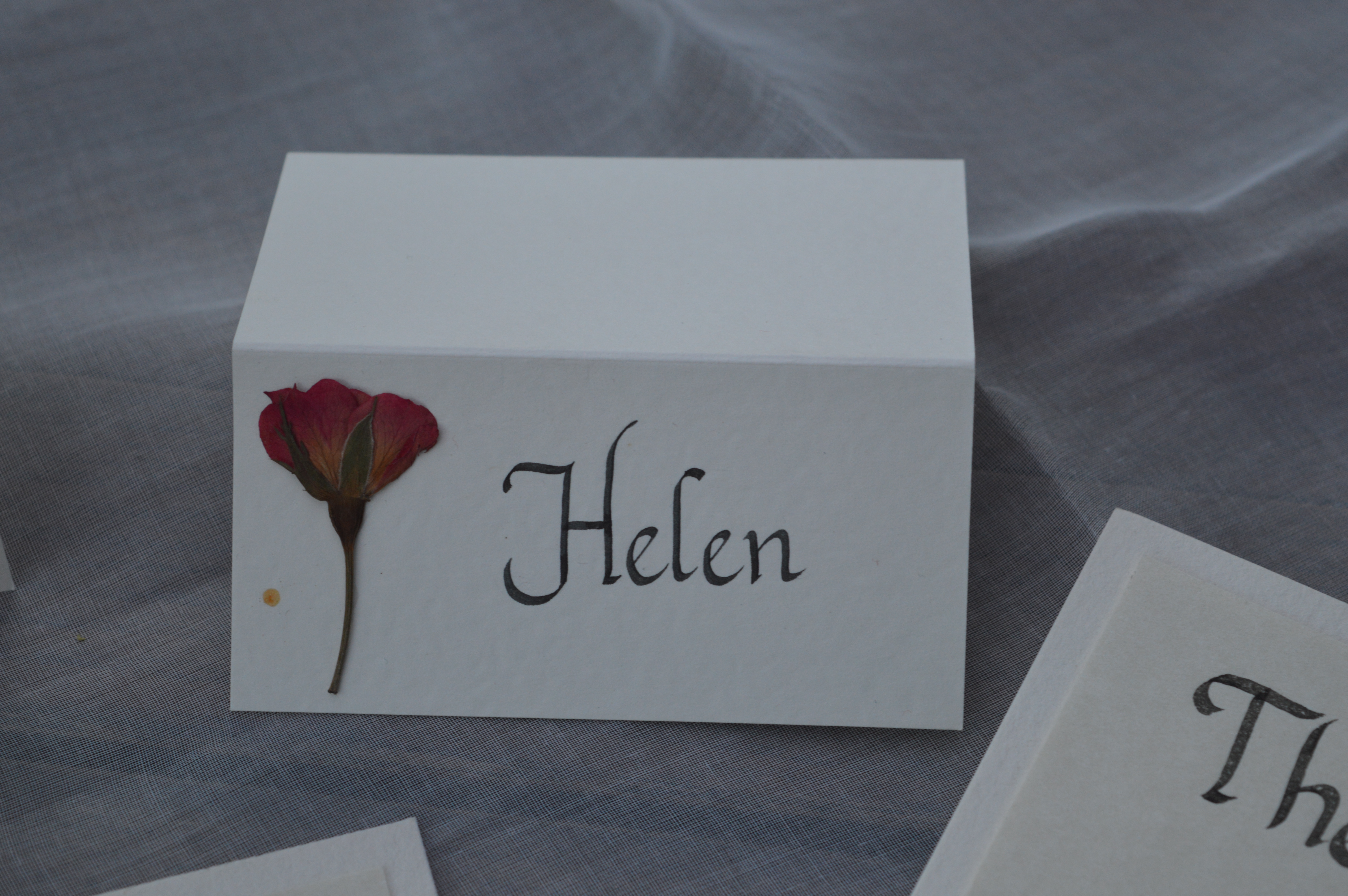 Place name cards were made with a rose on the side. I learnt calligraphy as a teenager so I wrote all the names out and also made a table plan. I’d often read in magazines that an average of 25% of guests can give back word for a wedding but I never quite believed it, however I have to say that 7 of our guests had to back out during the last week!!! At first I rewrote the table plan by hand, but I must admit that the last four ‘substitutes’ I just said ‘ok, you’re Janet and John, you’re Fred and Florence!