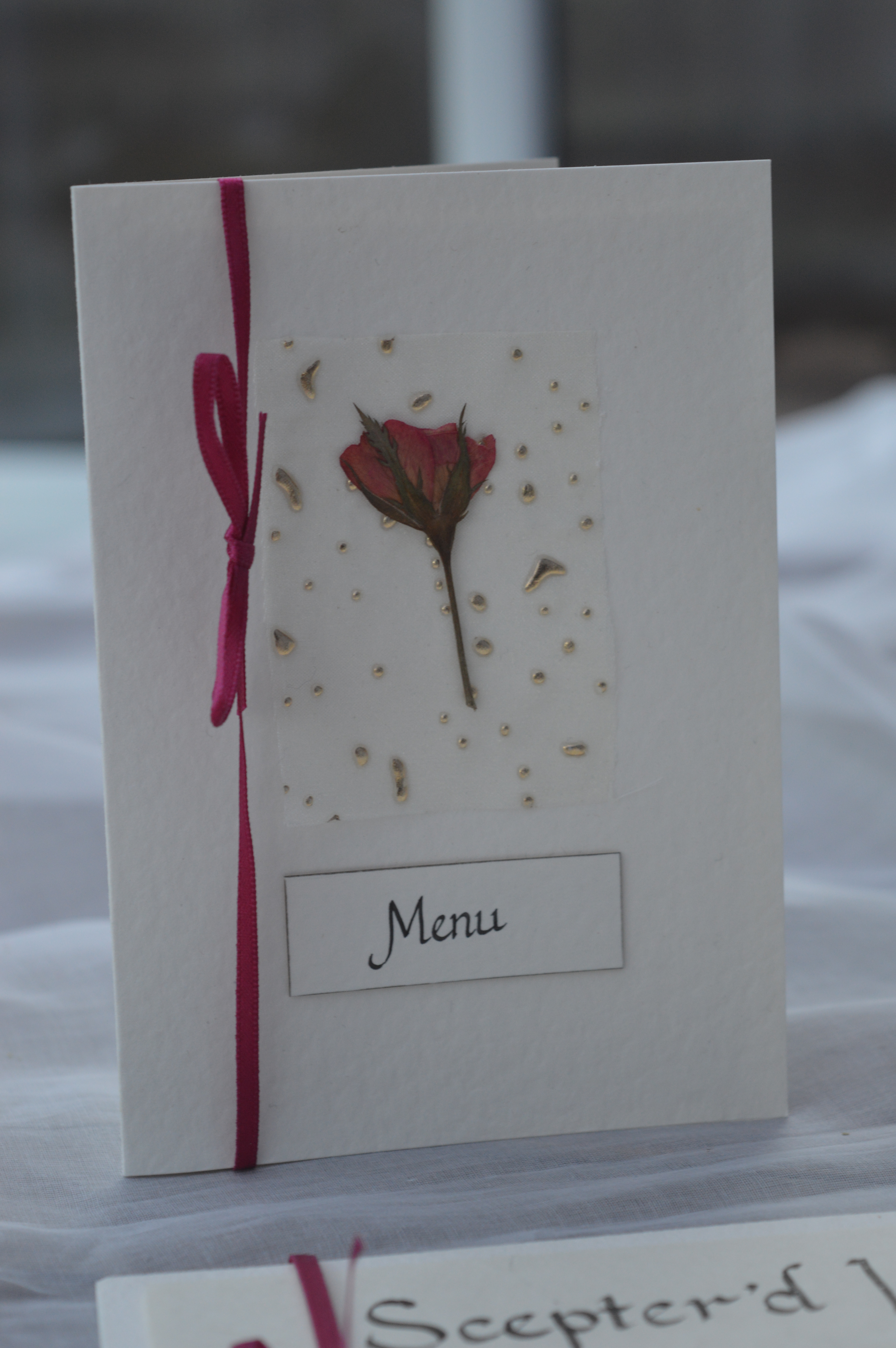 I worked out a very simple design of a rectangle of gold ribbon with a rose glued on top. A ribbon round the fold completed the card. We printed out our own centre pages on the computer, both for the invitation and for the menu.