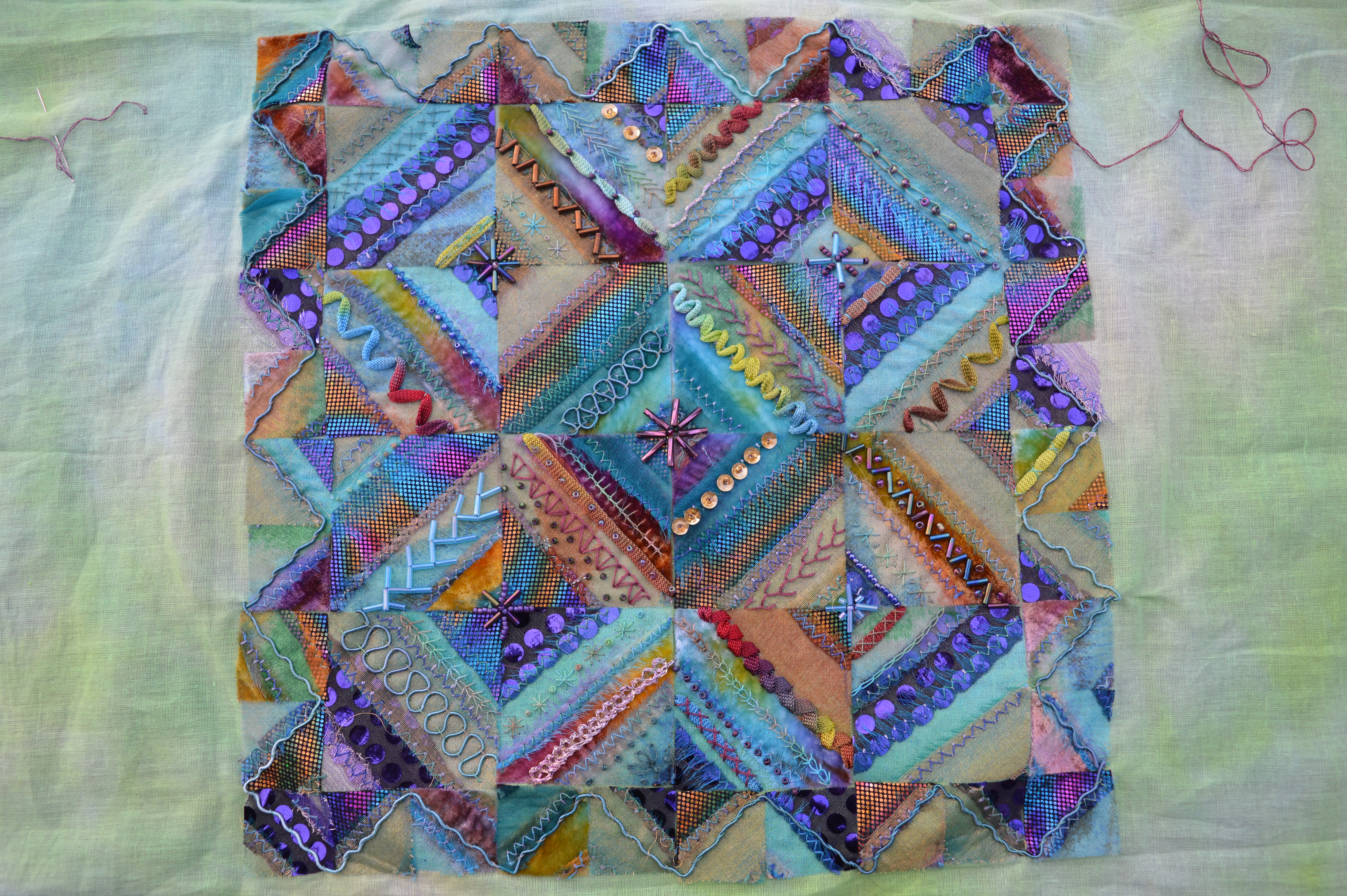 Hello, I’ve been thinking about making this Stef Francis Mosaic but as I have so many suitable fabrics and threads myself I didn’t need to buy the kit. However, I wanted to find out how to do it. I’m delighted to have found your blog, giving an outline of the method. I think your piece is beautiful and I love the colours. I’ll now have a look at my stash of glitzy bits and pieces and choose a selection of coordinating colours. Best wishes, Margaret