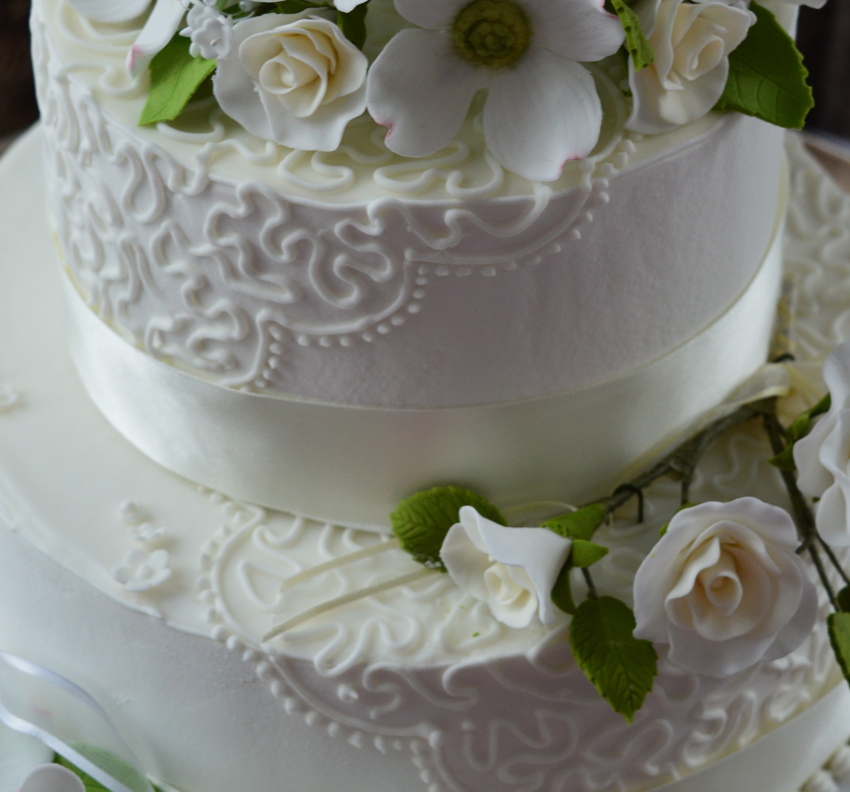I arranged the flowers for the top of the cake, using the filler flowers and leaves, together with ribbons and pearl loops to fill the gaps. I then tied a buttonhole type arrangement of roses and covered the stems with a ribbon bow which sat on the first tier. I made a similar arrangement of dogwood flowers to sit around the base. there were a few marks and imperfections on the base and the first tier so I sprinkled tiny filler flowers over the area.