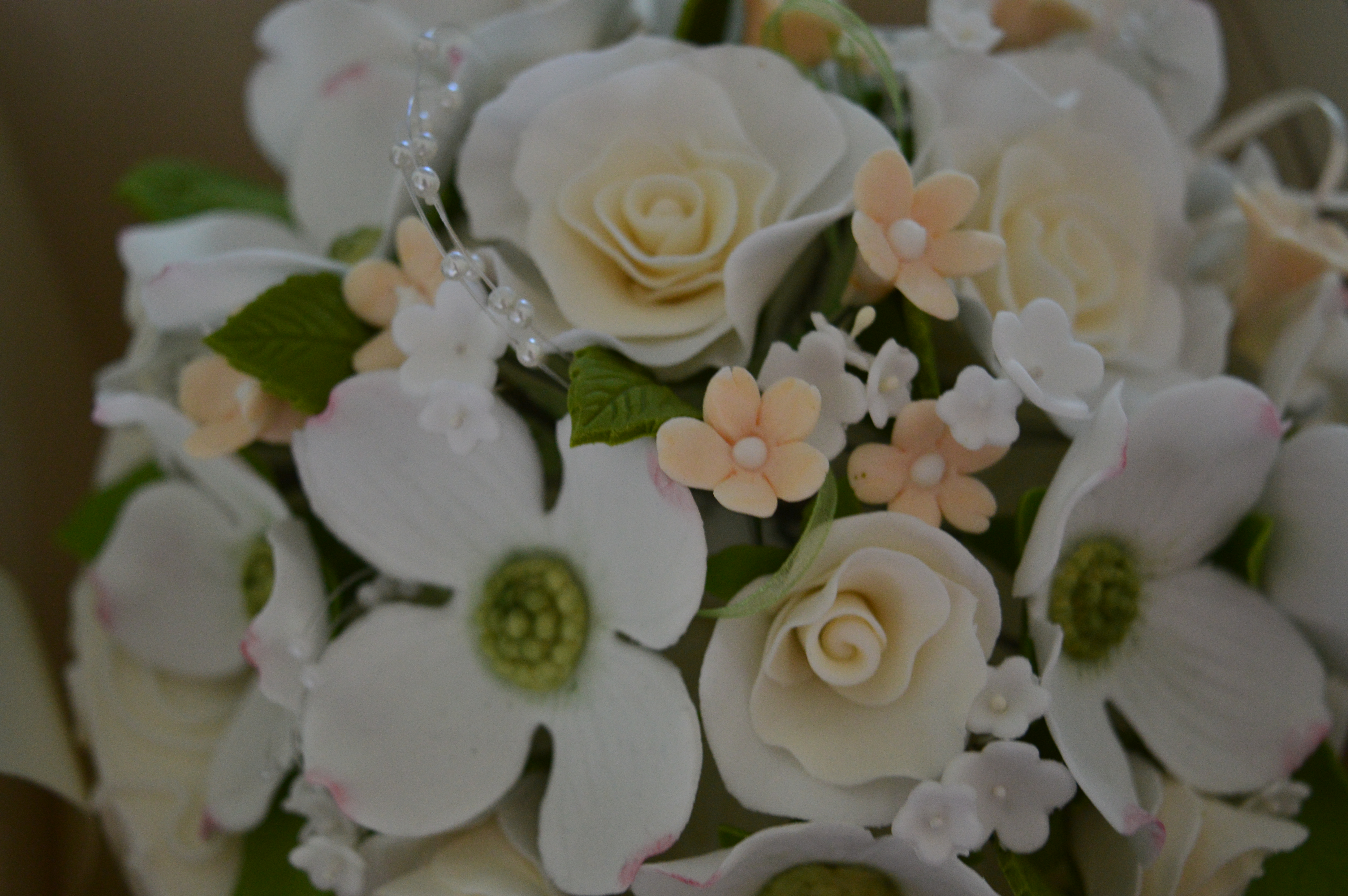 We had a long chat about the design as Kathy wanted to incorporate the American, UK theme into the cake. I didn’t fancy flags, my speciality is sugar paste flowers, I love making them and usually hope that if people are wowed by the flowers, they won’t notice imperfections on the cake!! I suggested combining the state flower of North Carolina, which is the dogwood, with the white rose of Yorkshire. She was delighted with the plan.