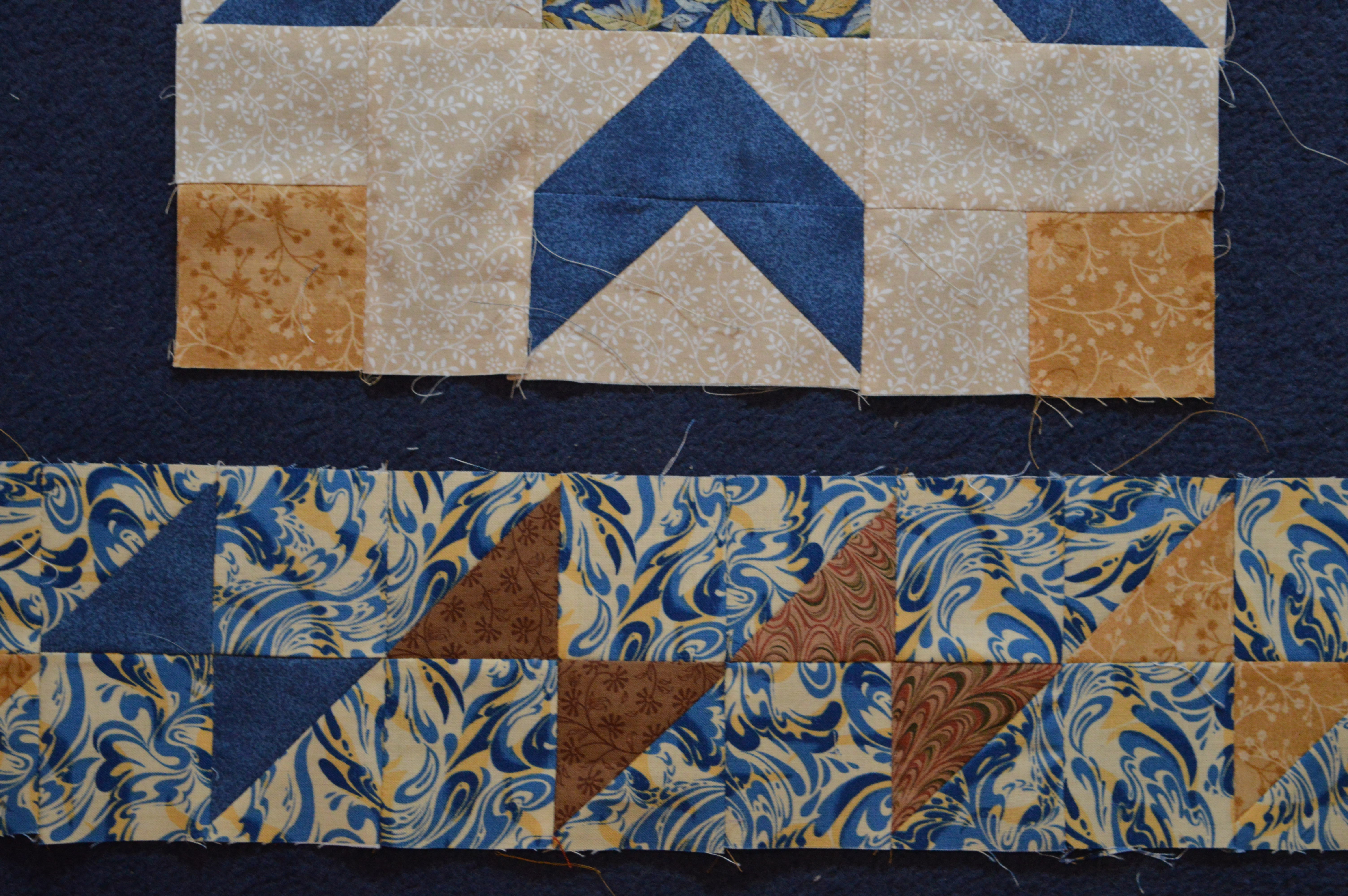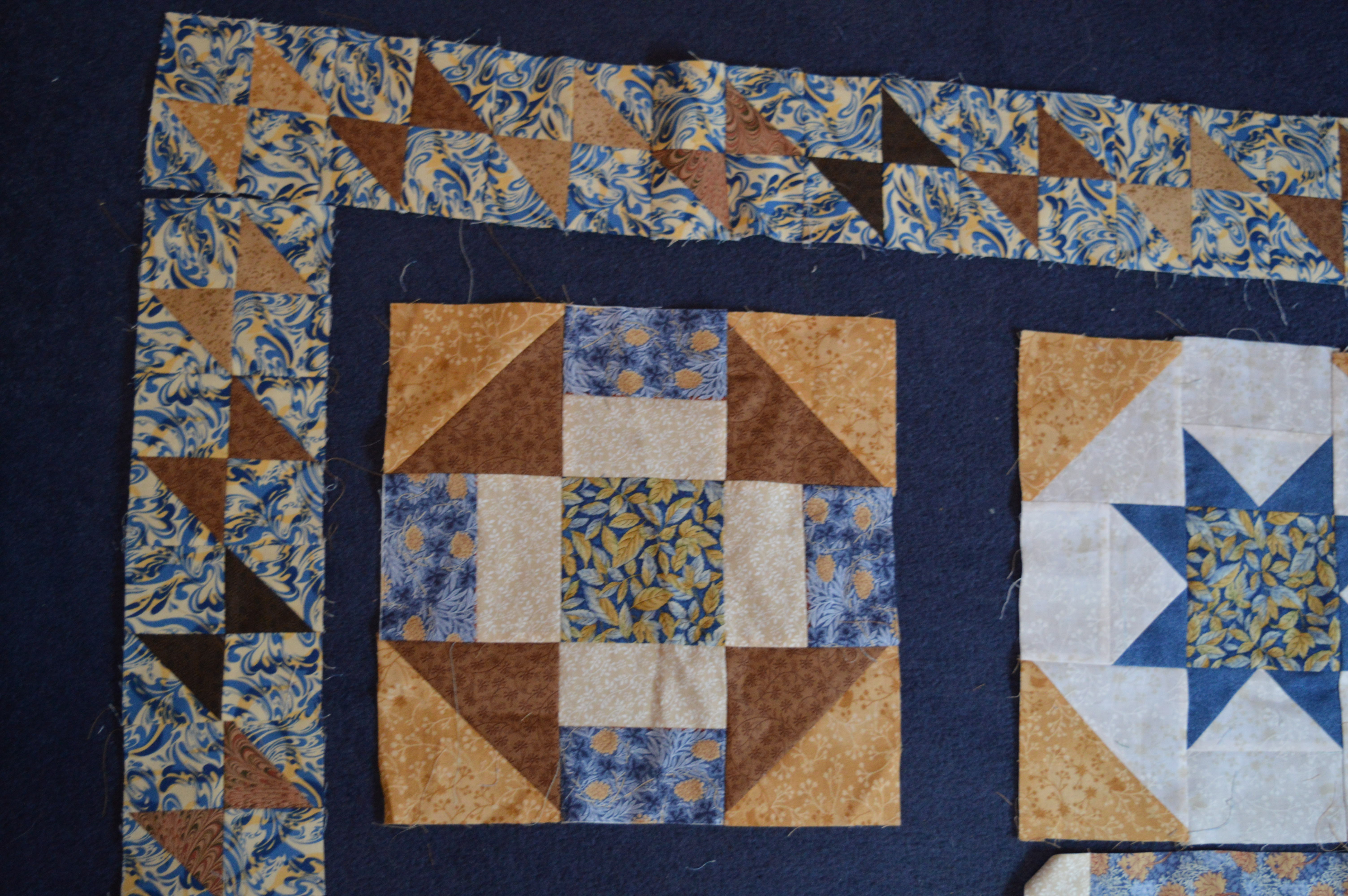 I then cut 50 squares out of different colours to make the contrast. Once everything was cut out it was quite straight forward to stitch, I just had to concentrate to make sure the patterns went in right direction! Trimming the half square triangles and the individual blocks to the perfect size was a bit of a bind, just because there is so many of them. However one thing I have learnt from doing this BOM is how much accuracy counts in quilting, it’s basic maths really but if seams are 0.5mm too wide, or blocks slightly too big, then over the length of a border it can add up to 1-2cm, which then gets pretty obvious! Time will tell how accurate mine have been!!