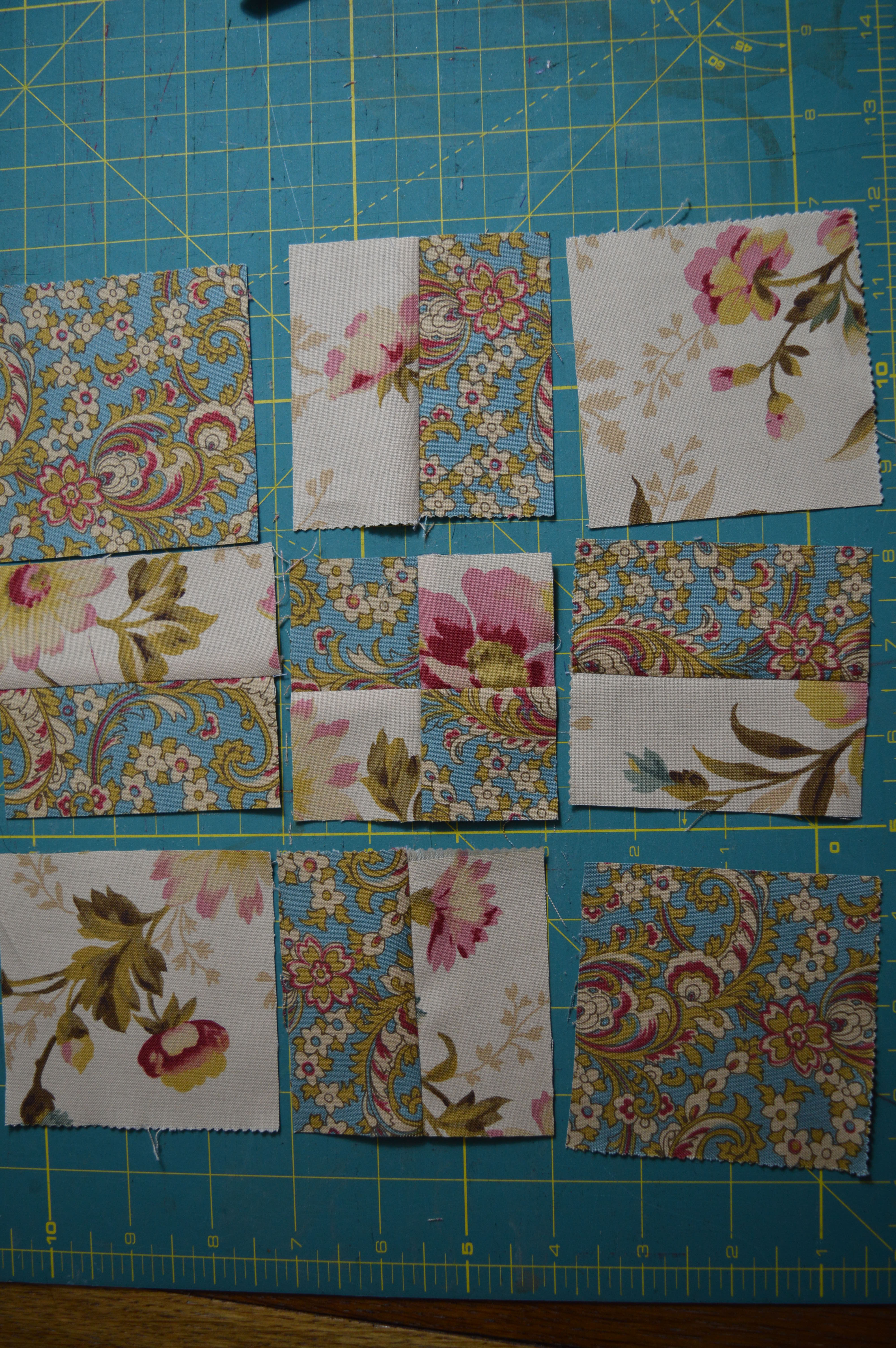 I need a quick quilt pattern, the last one I made was a disappearing 9 patch, this time I’m using a disappearing 4 patch. With the 9 patch you start off with 9 squares stitched into a block (3×3) and then cut it into quarters before rearranging it, whereas with the 4 patch you start off with a block of 4 squares, then cut it into 9 pieces, invert the narrow strips before restitching into a block.