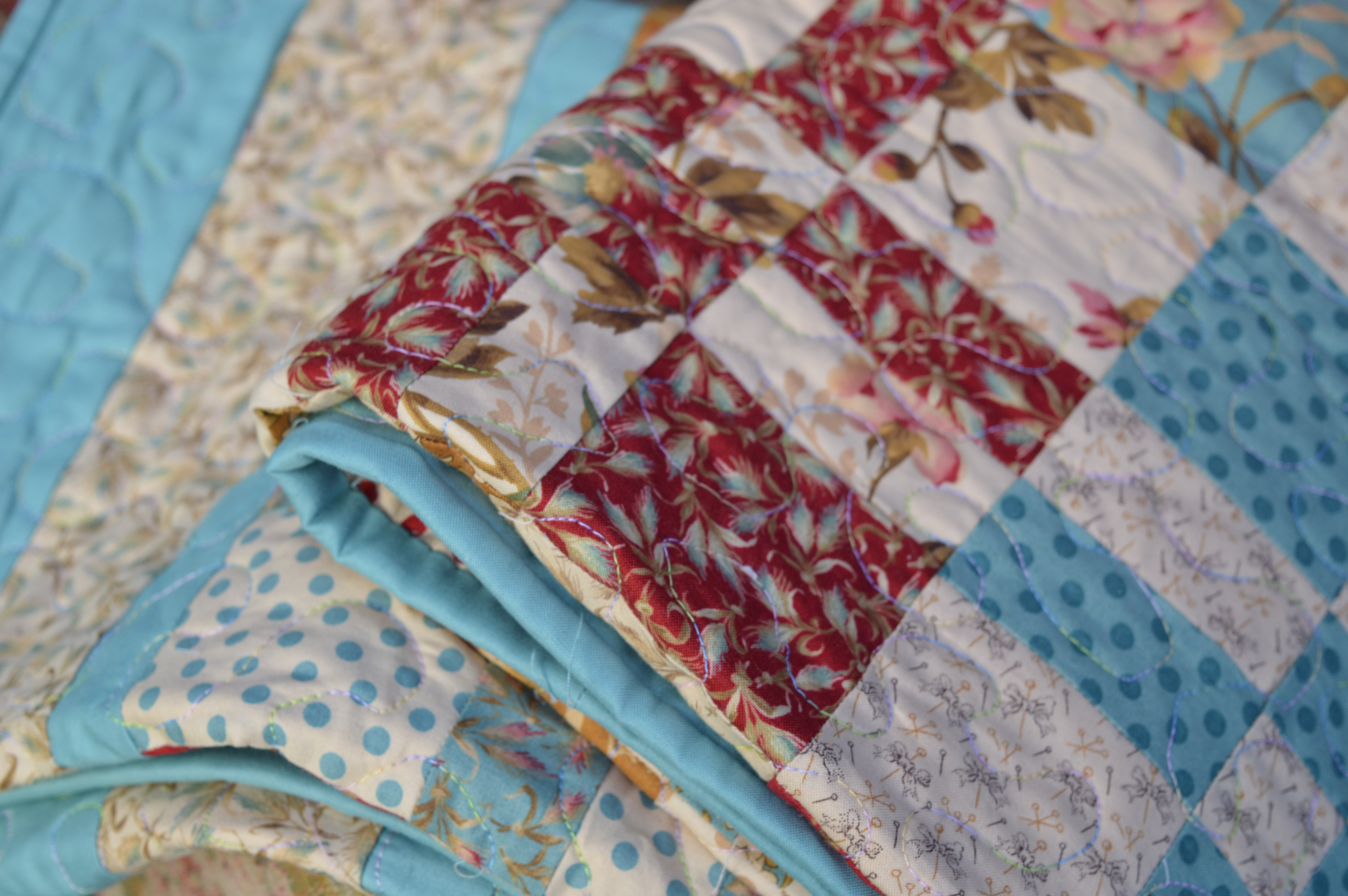 I chose the disappearing four patch as it’s fairly quick to put together, I had a Moda layer cake in my drawer so I cut them into 5″ squares as the basis for the quilt. It went together fairly easily after a slight pickle with the borders and insufficient fabric!