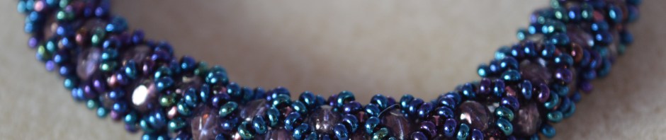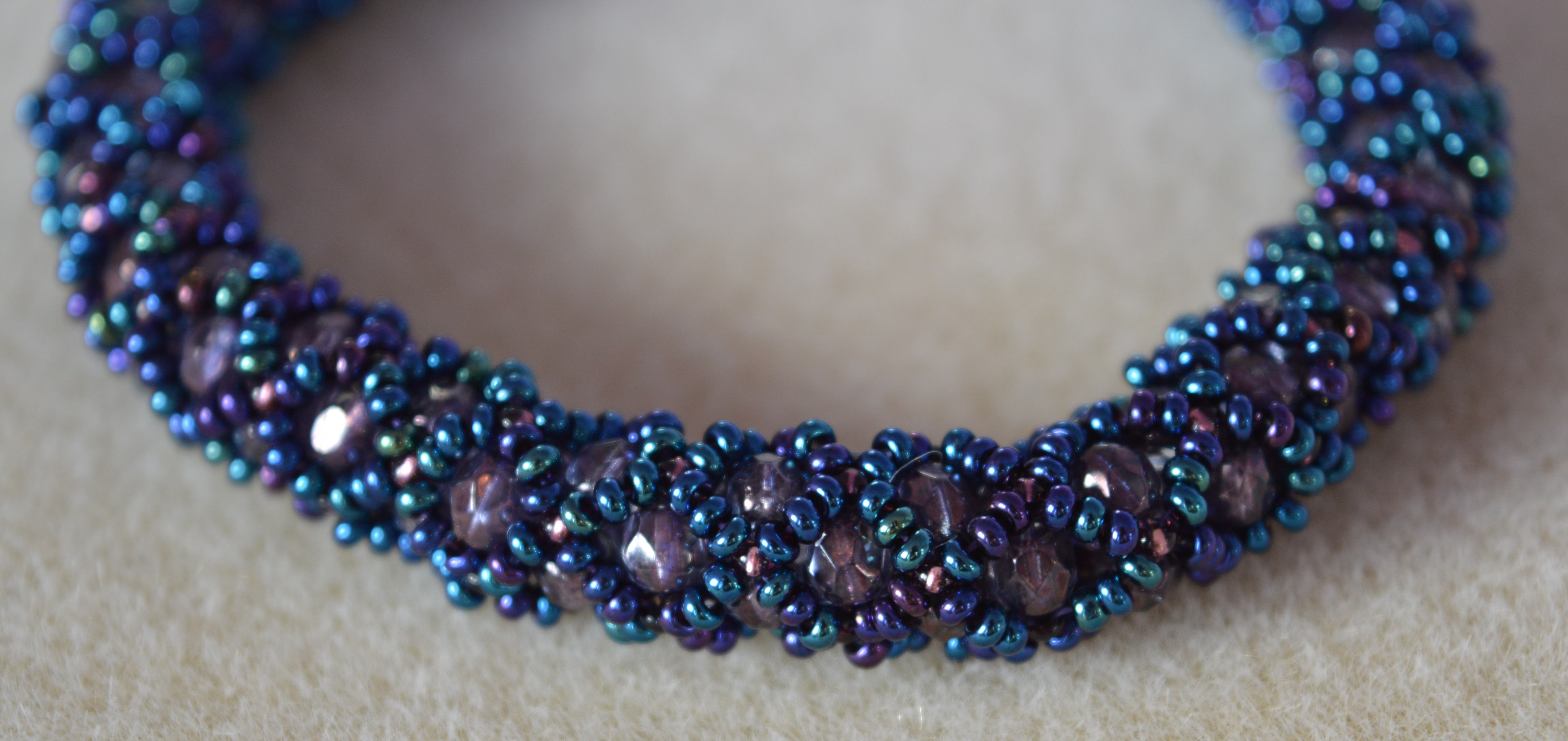 Trellis BangleThe tutor was Sally Boehme, she was lovely and very patient. The bangle I chose was made from three different beads, some gorgeous peacock coloured seed beads, some pale amber seed beads and a lavender Czech faceted beads.