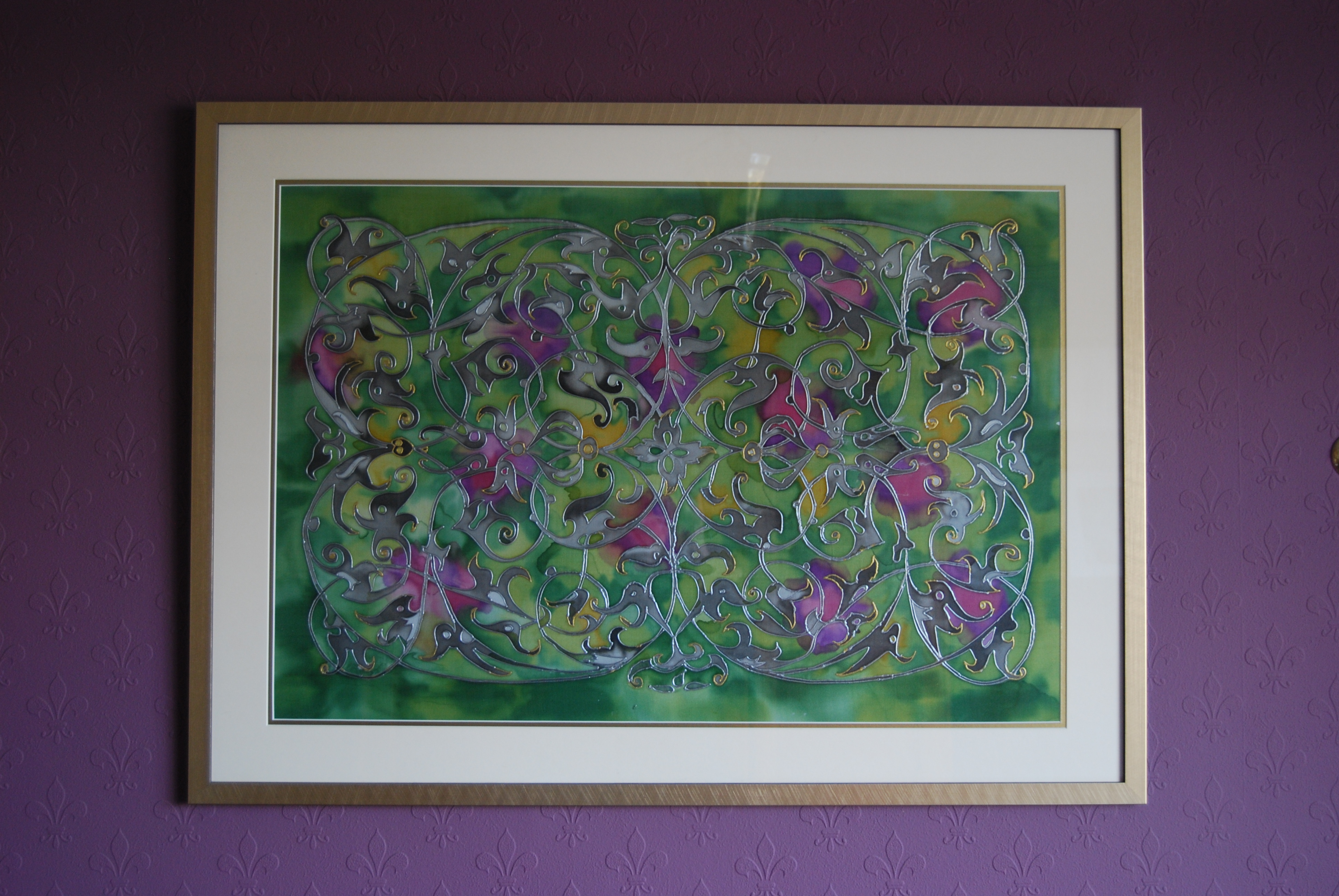 Silk painting, on the other hand, is like painting by numbers. You can trace your design and then paint it. My first dabble at silk painting was at a WI workshop many years ago, I painted a vase of tulips which I still have framed in the hall. I didn’t do any more for years until I wanted a big picture for our bedroom. I’d made a feature wall by painting it dark purple and it really needed a big painting. I couldn’t find anything I liked at a price I liked, so I decided to paint my own! I found a design in an Burda magasine, had it enlarged at a copy shop and painted it. The background was meant to be plain, but I did it in greens and purples, using silver and gold gutta to outline it, my inspiration being looking through park gates at the flowers. I’m still proud of it.