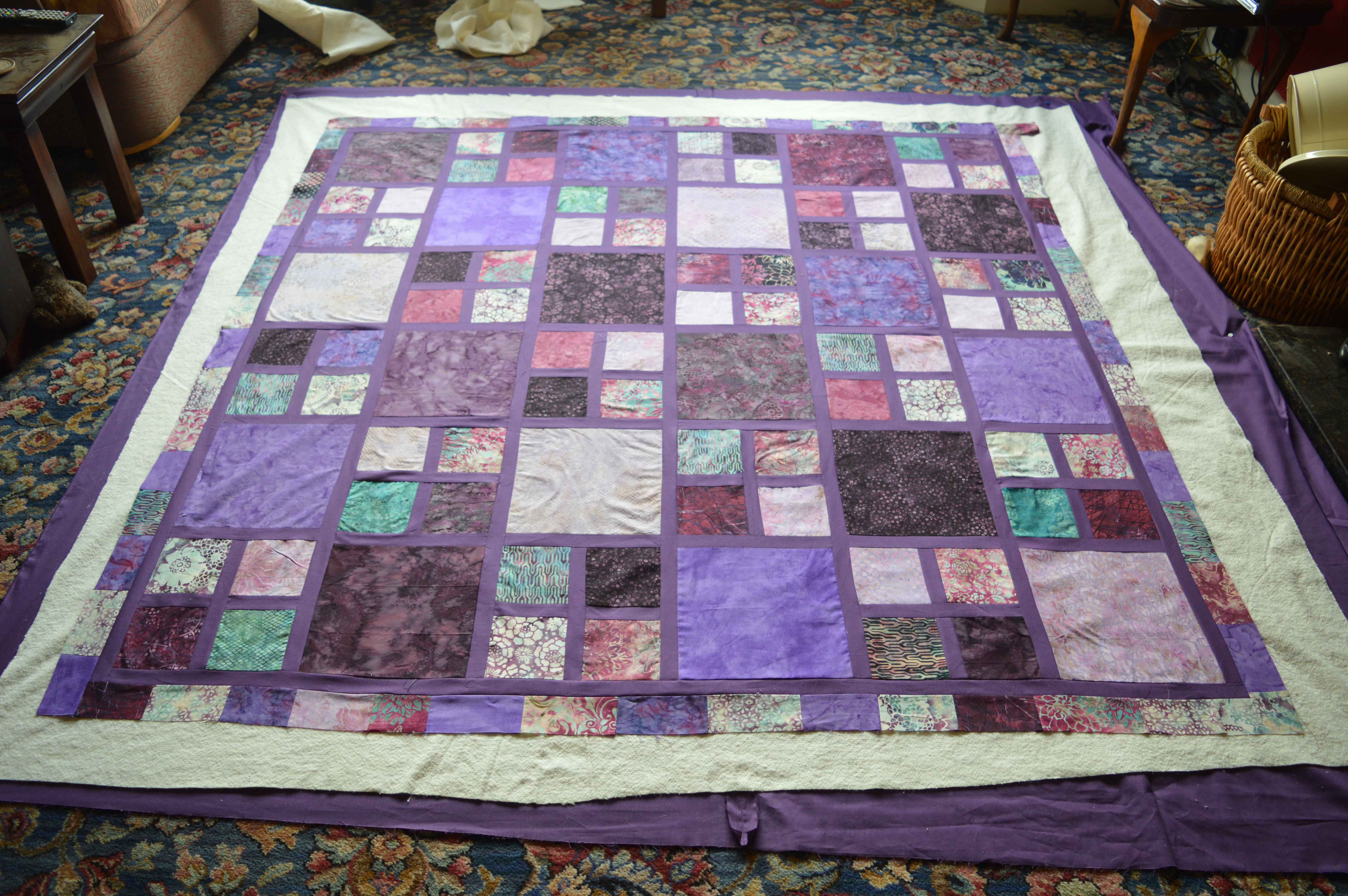 Purple QuiltOnce I was happy with the lay-out it went together fairly quickly, I sashed the sets of four first and trimmed them down to 10″, then it was just a matter of working my way across the blocks. It wasn’t quite big enough at this point so I used the scraps to make a border. I laid it out on the lounge floor to spray baste it. I love seeing it at this stage, all beautifully smooth.
