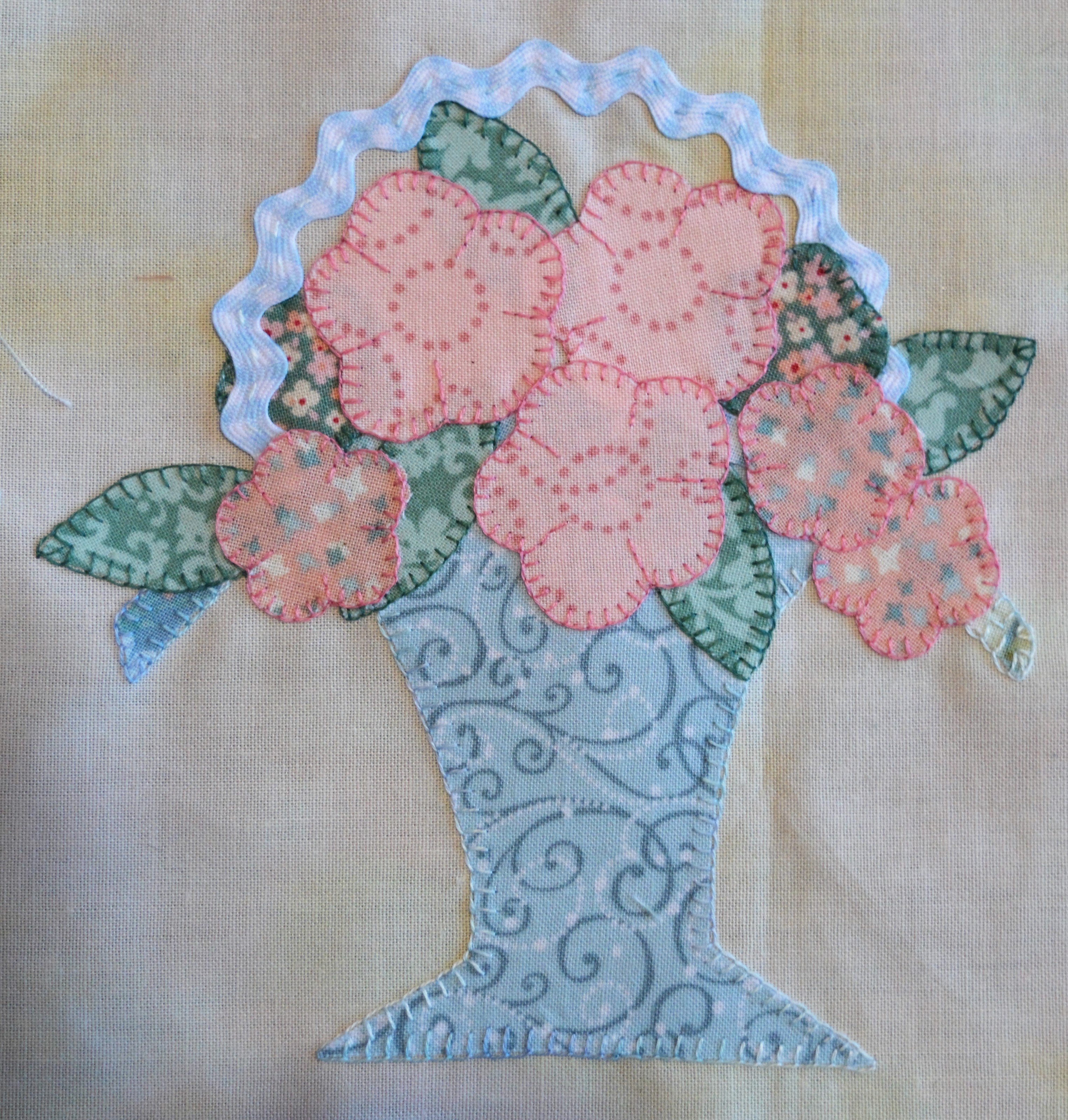 The Vintage Flower basket block was released last week, they had dropped hints that ric-rac was involved, so when I was in London, I picked up a couple of lengths in mauve and green. Well I don’t know what happened to them but I haven’t seen them since! It’s worked out for the best in the end as when I was selecting my fabrics I chose a pale blue pattern for the basket. I popped into Samuel Taylors on Thursday and spotted a pale blue checked ric-rac. OK so it was twice the price of plain ric-rac, but I only needed 50p’s worth and it coordinates perfectly.
