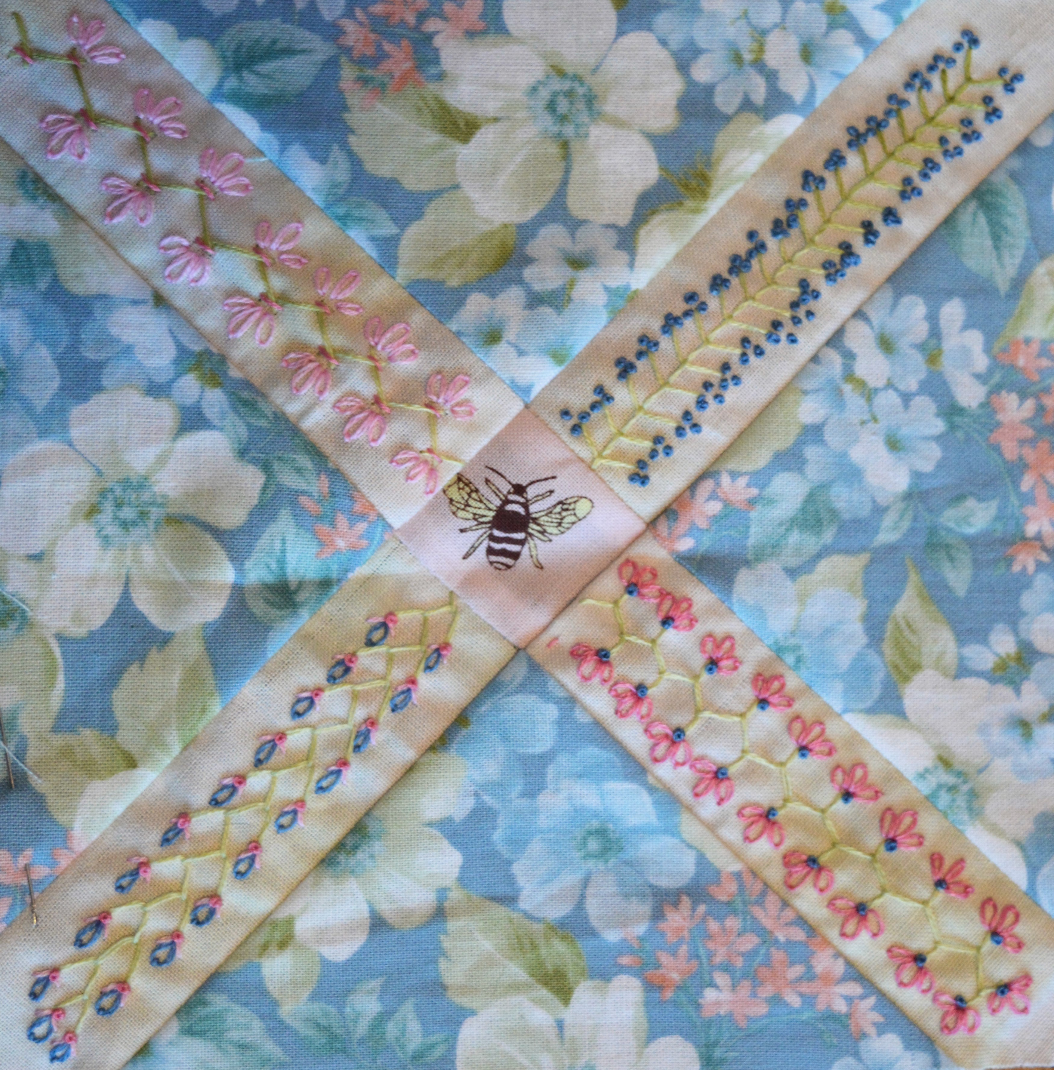 Block 35 was released in the middle of June. It’s called ‘The Wishful Garden’ and was designed by Kristyne Czepuryk. I pieced it a couple of weeks ago as the basic block is pretty straight forward, but it took until this week to have the time to sit and embroider the strips. I learnt one new stitch, creatan stitch, I had to get my book out for that one. The other stitches are feather, fly, herringbone, lazy daisy and french knots. I think if I was stitching it again I’d be tempted to either use a variegated thread throughout, or use a darker green than the one I chose.