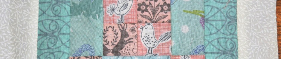 This afternoon I made ‘Starting Point’ by Lissa Alexander. I’m really pleased with this one, I don’t always find it easy to put the fabrics together but somehow this one has worked really well. I fussycut the pink blocks, I couldn’t quite fit both bunnies in so I decided to aim for one rabbit! I chose two greens and two blues for the sides. As the sashing I’ve started to do incorporates a block in each corner, I decided to continue the pattern into the sashing!