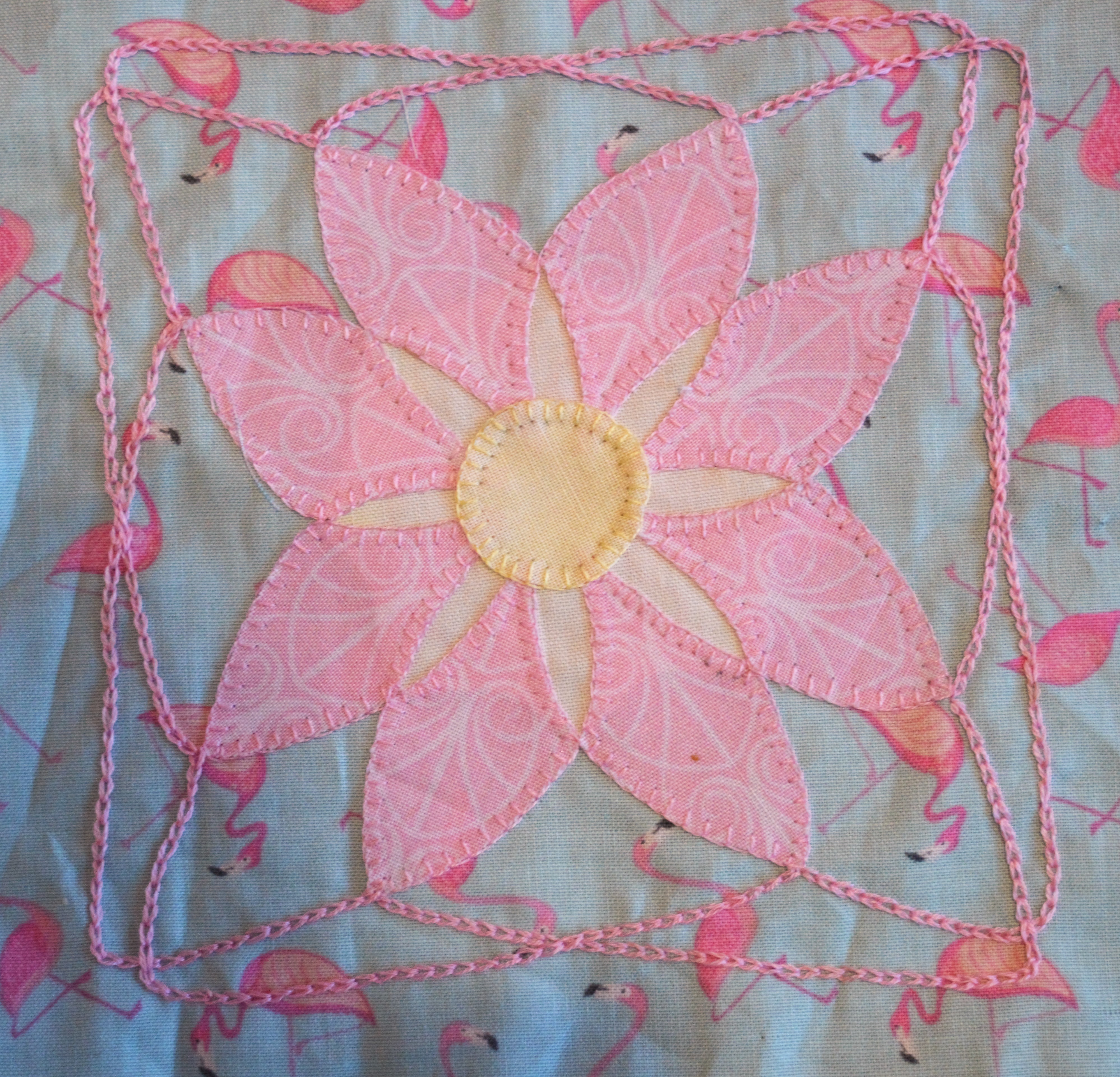 Block 47 was designed by Geta Grama, it’s called Circle of Love. I’ve nick-named it Flamingo Flower, I love this flamingo print, it’s not the sort of pattern I usually go for but it made me smile! The design has the outer part of the block made with applique too, but I felt I would get a neater effect by embroidering instead, I just chain-stitched round in a matching pink thread.