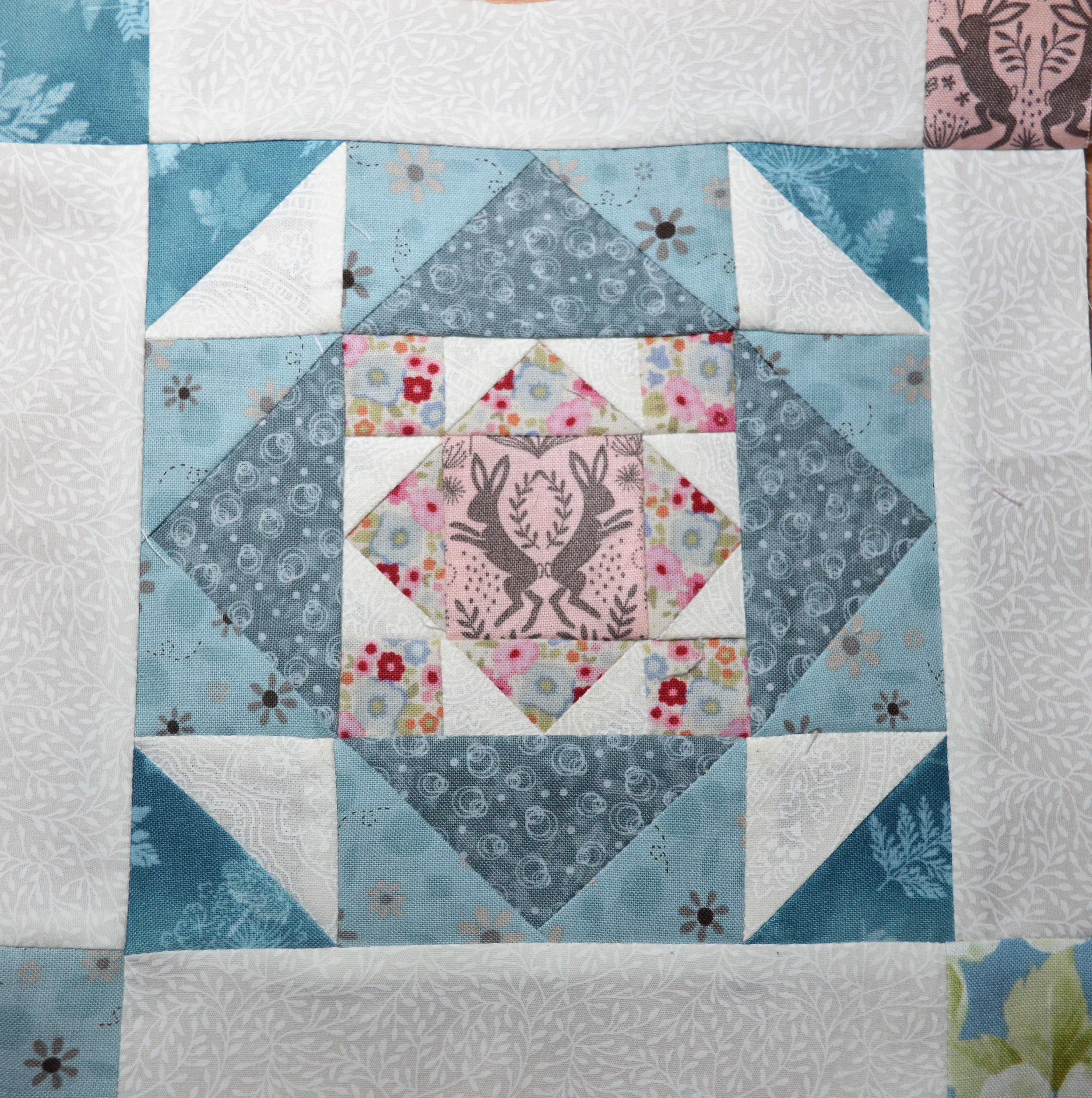 The final block was designed by Kate Spain, it’s called ‘Centred’. It was a lovely block to finish with, it took a bit of thought to work the colours out, and a bit of time and concentration (not to mention the odd outing for the stitch ripper!) to stitch it. I decided my rabbit fabric could have a final outing for this block, it seemed apt seen as they also had pride of place on the very first block, they are surrounded by a field of flowers!