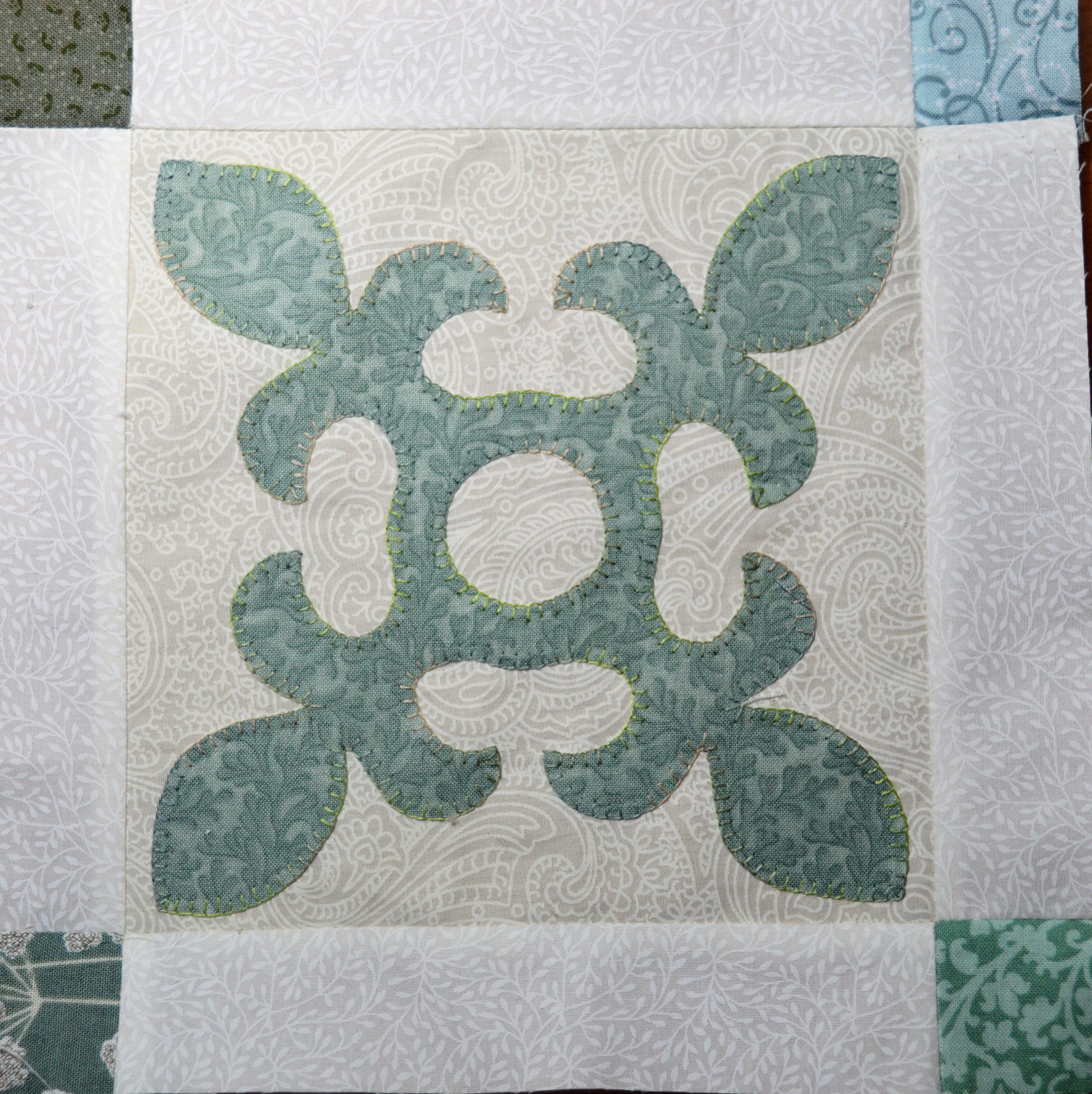 I’ve actually got three blocks to show you, block 97 was designed by Lynn Harris, it’s a mixture of a french Fleur de Lis and Hawaiian applique techniques. It’s called Fleur de Lei, I must admit I chickened out of the Hawaiian tecnique and just used bondaweb and blanket stitch. I used a variegated DMC thread, I wasn’t sure about the colours at first as the fabric is a very soft green whereas the thread had alot of yellowy green in it, but as soon as I started sewing with it I liked it, it just gives a bit of a subtle lift to the block.