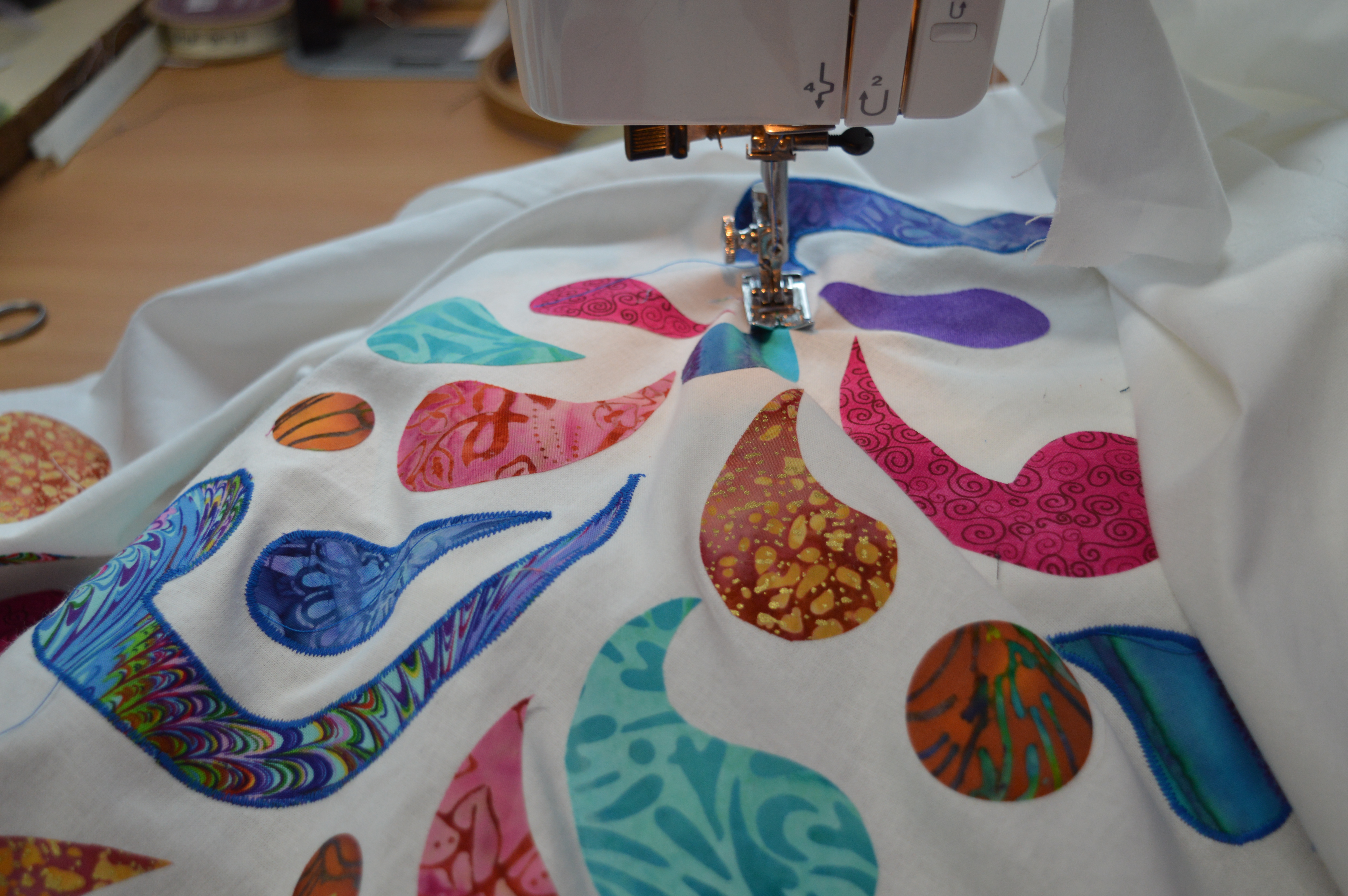 Yesterday afternoon I raided my scrap box for some suitable patterns. I ended up with blues, greens, purples, pinks and the occasional bit of orange. I need to make this quilt fairly quickly (the event is on May 11th!) so I used Bondaweb, playing around with the shapes until I was happy with the colours and the arrangement. Having secured them on the background with the Bondaweb I used a narrow zig-zag to stitch them all on.