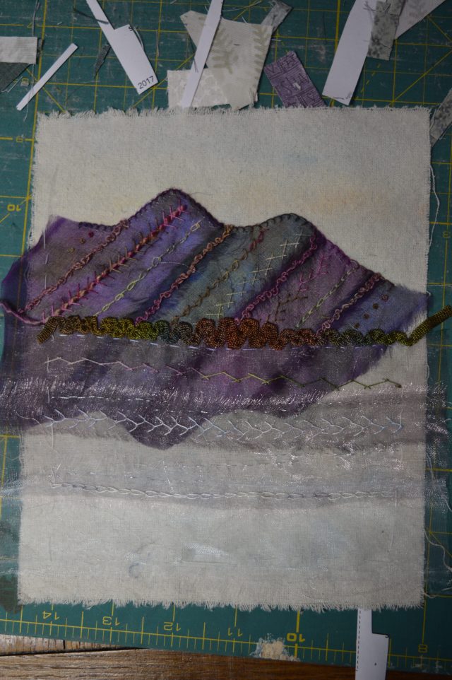 I still needed something for the trees along the shoreline. My initial idea was to use a textile which I think is made from bark, it sort of looked right, but somehow didn’t, probably because it was the only non fabric item. I decided to try some hand-dyed viscose ribbon I just stitched it in a zig-zag sort of pattern, making it taller in the middle. I think it works well.