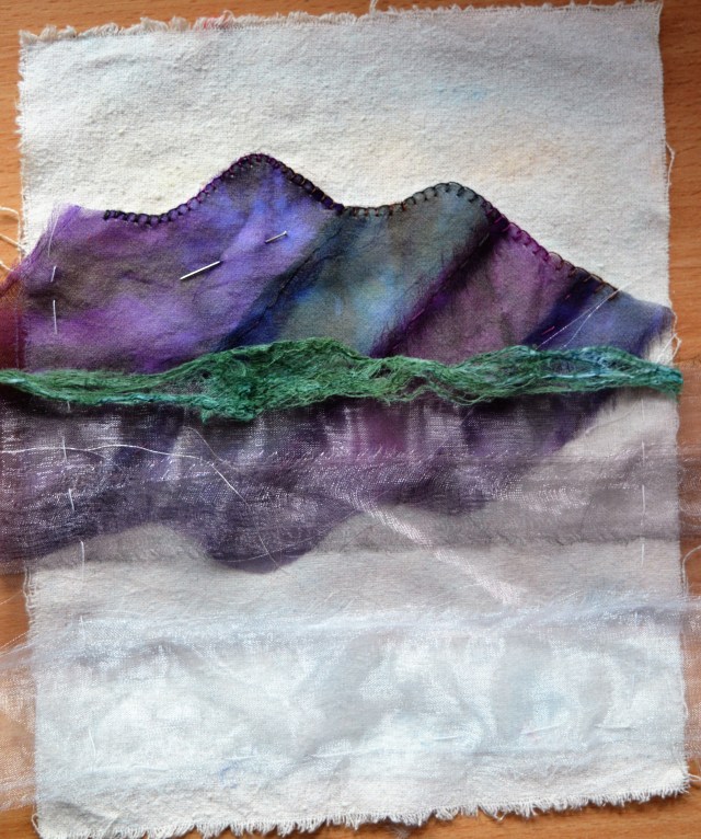First  I dyed some nial silk with silk paints. I wet the silk first so it was nice and smudgy. I stitched the fell from torn strips of hand-dyed chiffon as before. The strips lie diagonal to show the shape of the fell. I decided to ignore the fact that the reflection should be a mirror image with the diagonal lines running the other way, call it artistic license!! Once the organza was overlaid it didn’t really show!
