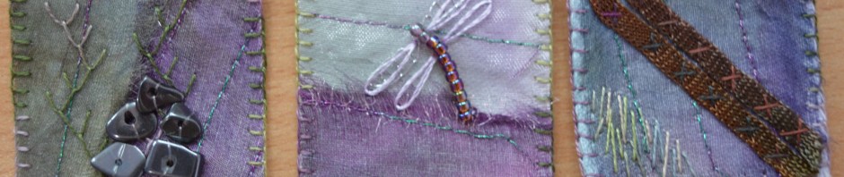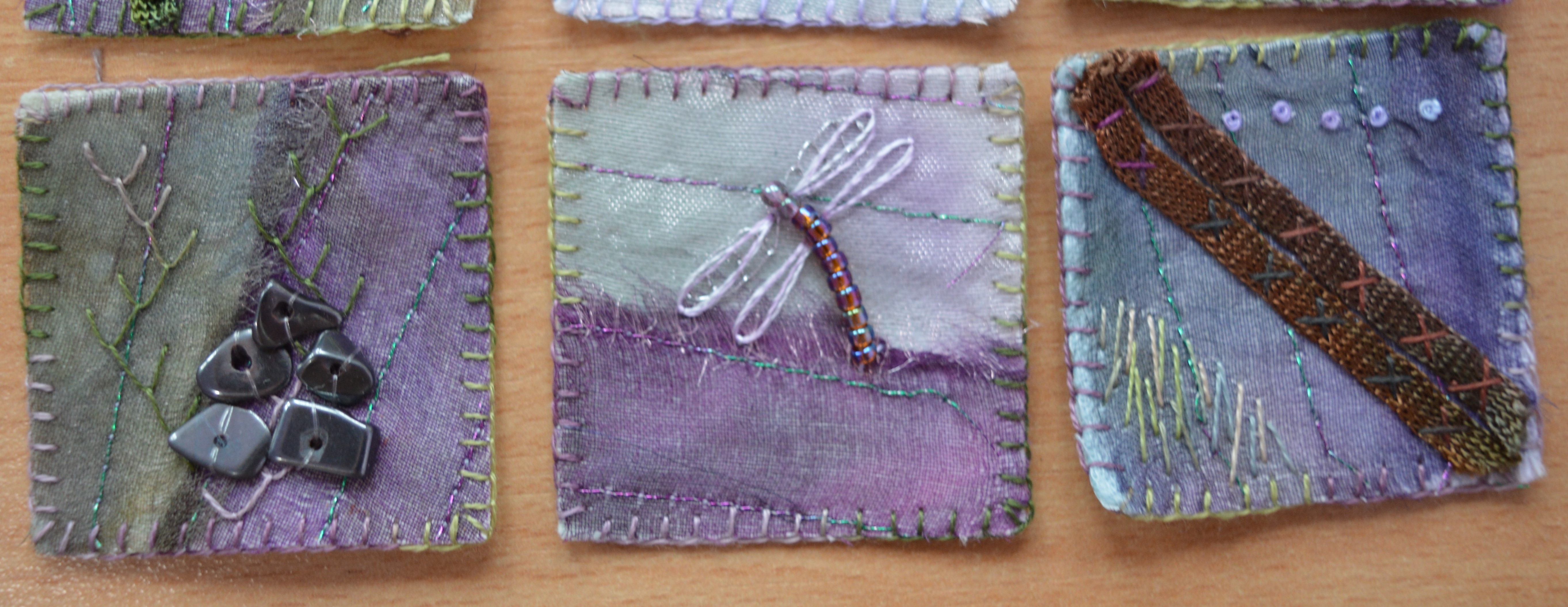 I think the duck boards inchie is my favourite. The duckboards are wooden planks that cross the marshy ground at the end of Derwentwater. If there’s been a lot of rain and the lake is high then they are impassable and you have to walk into Grange village instead. The boards are two planks wide with passing places every so often. As a child I used to love crossing them as the reeds seemed enormous and there’s lots of colourful dragon flies flitting around. I used beads for the body and initially blanket-stitched the wings in silver thread. It wasn’t quite enough and I remembered the silk threads I bought on ebay recently. They are very fine with a beautiful gloss, a lazy-daisy stitch worked perfectly.