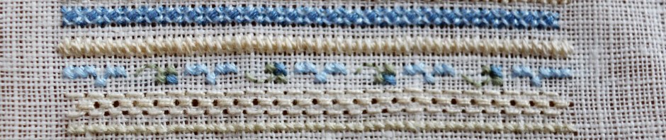 It’s a strip sampler, there’s a little cross-stitch but it is mainly what I would call hardanger embroidery, pulled thread with perle cotton, and lots of different embroidery stitches. So far I’ve stitched double back squares, Italian cross, 2-colour rice, Parisian, St Andrew-St George, cable, satin. herringbone, double herringbone and hem-stitching. So lots of new stitches to learn. It’s only three inches across so it doesn’t take long.