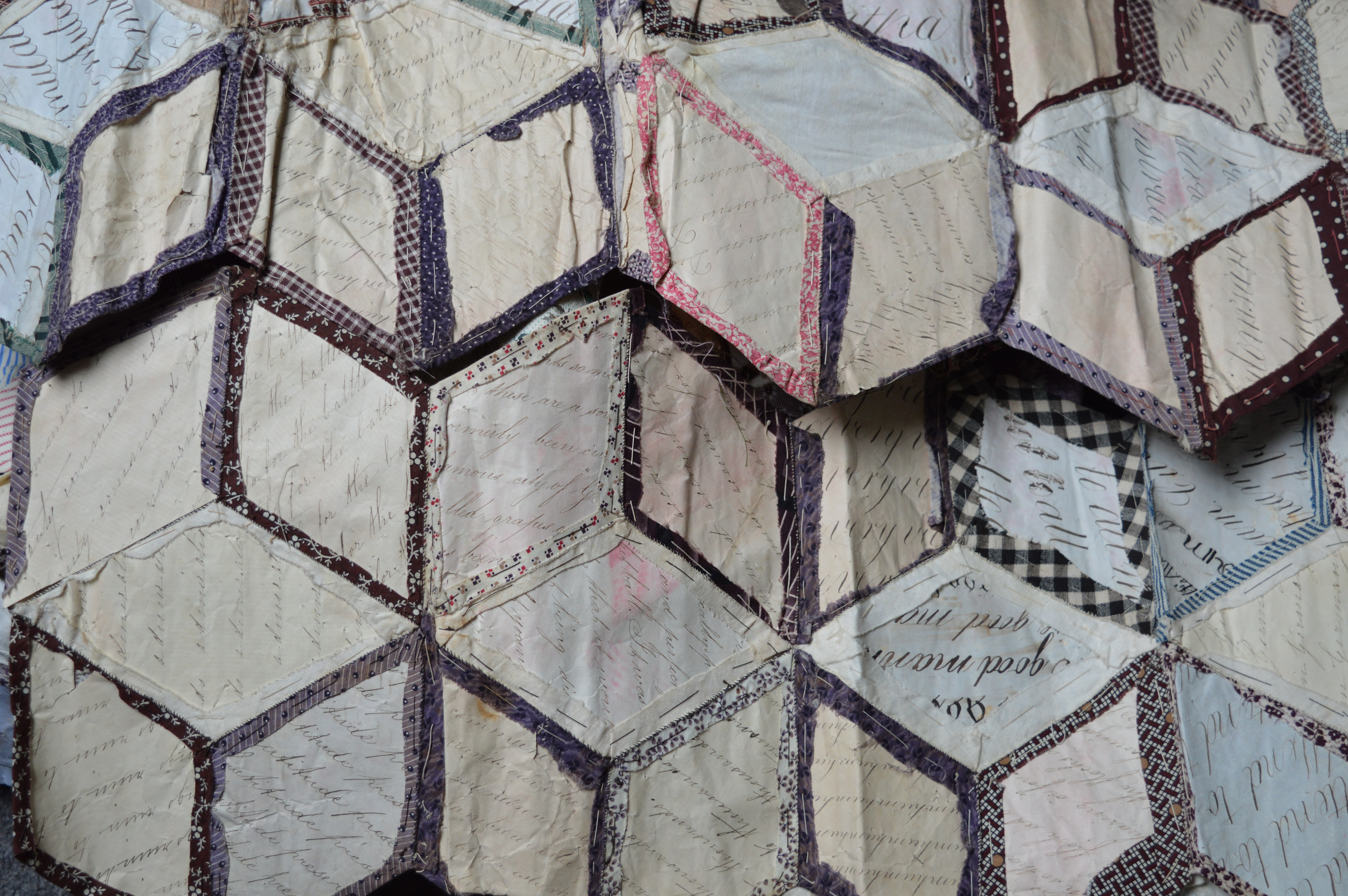 It’s all hand paper pieced, what I love is the paper that she used. It looks like old school books, many of the papers are covered in beautiful copperplate handwriting, as if she was practising her writing. The papers have been removed from most of the main quilt, but they are all still in place in the ones waiting to be attached.