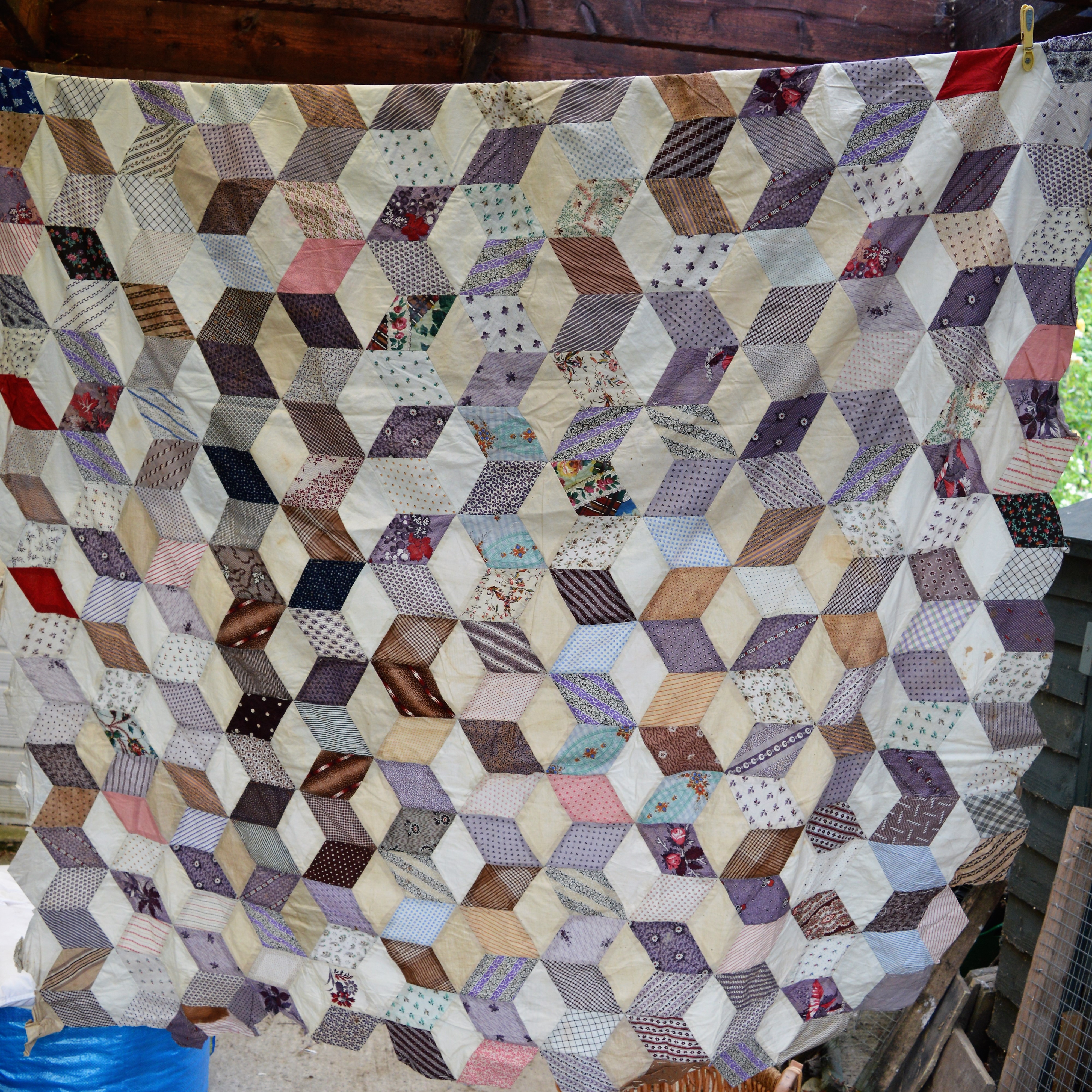 The block is indeed called Tumbling Blocks. I’d recommend not using any old bedding fabrics, as they are a much tighter and finer weave, and may over time distort the quilt. For more technical advice on restoration, you may find that Tim Latimer in the US is a helpful person to contact as he has restored and completed many old quilts. His blog can be found here: https://timquilts.com. I think I have read somewhere on his blog that he has used tea to dye fabrics to achieve a vintage effect on new fabrics, but I may be wrong, it could have been elsewhere!