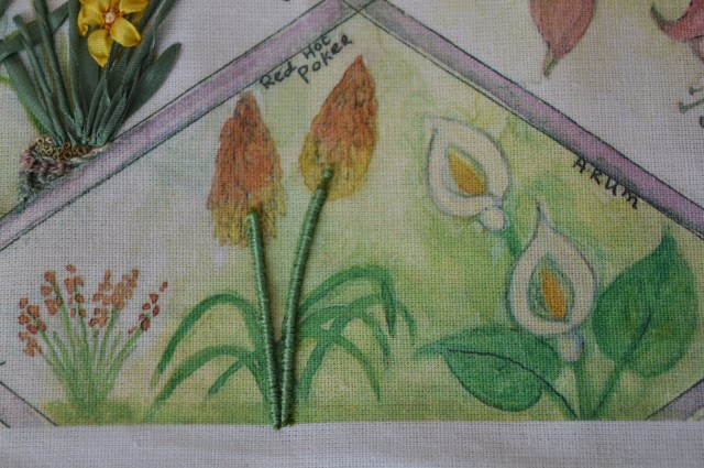 The flowers of the red hot pokers are stitched with loop stitches, I’ve not seen these before but they are basically a row of tiny stitches formed over a big needle. Three size 26 needles are needed, one to stitch with, one to stitch over, and one to hold in place the row before.