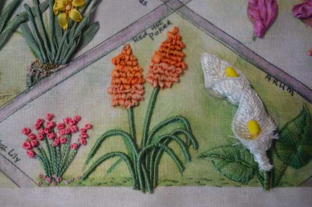 The natal lilies to the left are french knots stitched with 4mm ribbon. The stems are meant to be over-stitched wire, but I thought it could end up pretty bulky for a little flower, so I just used straight stitches of perle thread. A few little filler stitches and another diamond was complete…