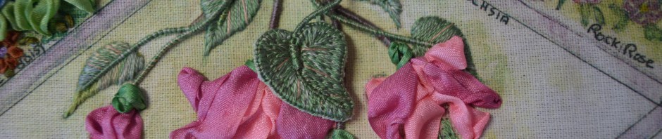 The buds are stitched with a lazy-daisy stitch, the flowers are just in basic ribbon stitch, my main problem was trying not to catch the tails of one petal in the stitch of another. The base of the flowers and the buds is made with a grab stitch. I used a strand of DMC to shape the flowers a little more.