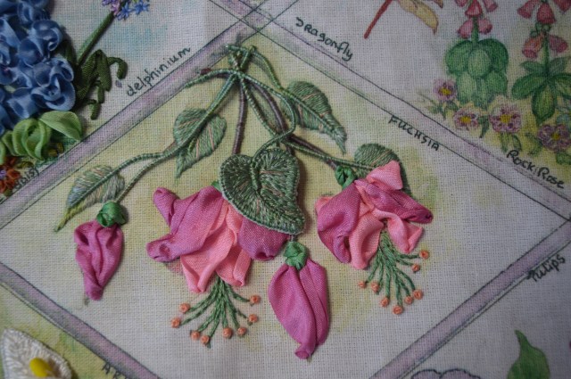 The next diamond was fuchsias. To be honest this diamond has been a bit of a brick wall since I started this project, probably mainly because it calls for 15mm organza ribbon, by which I think it means silk organza ribbon, I couldn’t find anything anywhere and I’m sure you couldn’t embroider with synthetic organza. I decided to just use silk ribbon. First I had to embroider the leaves and stems…