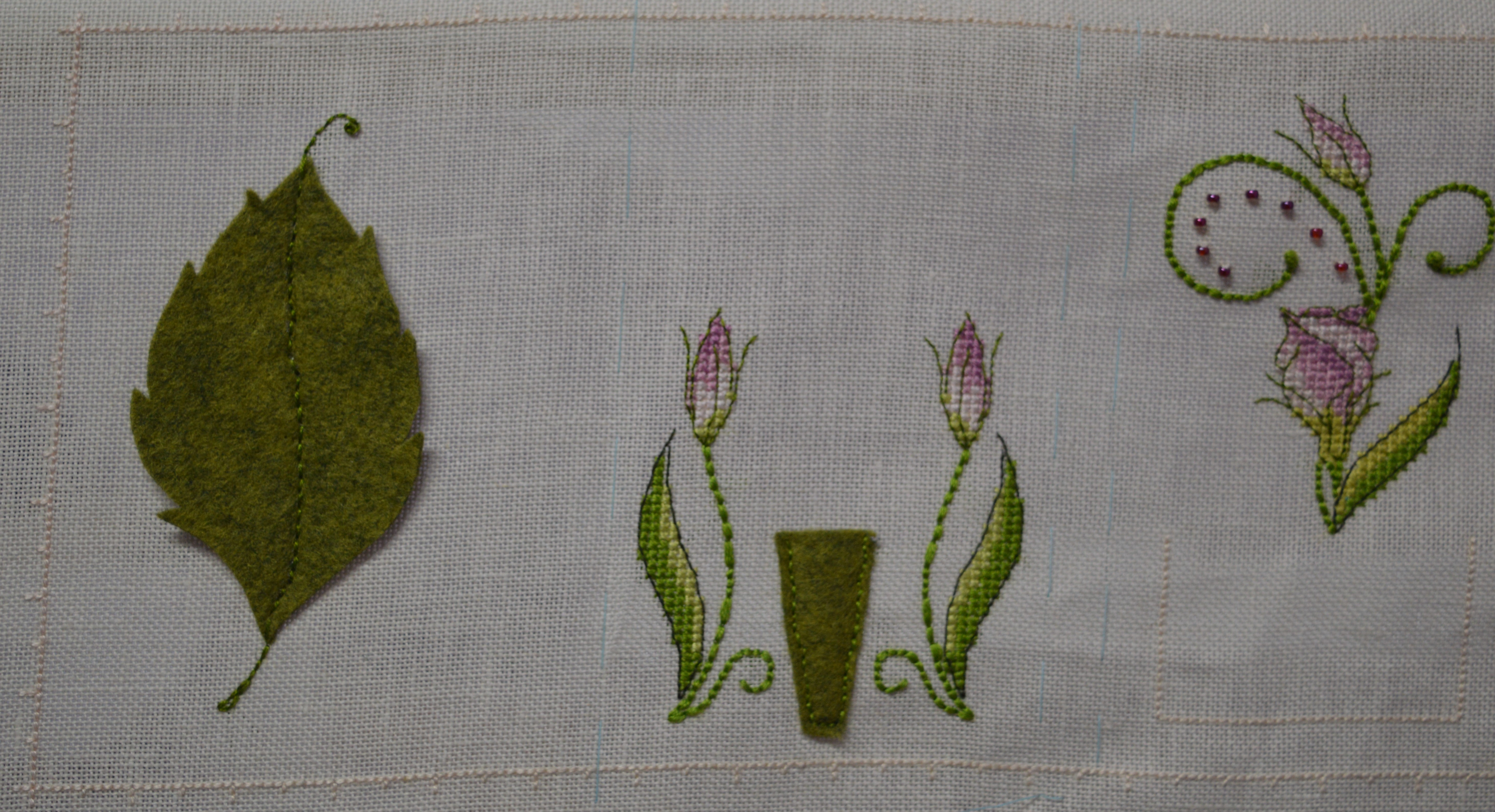 As a needle holder Faby has designed a lovely felt leaf, back-stitched up the middle both to attach it and to give a bit of interest. I think that was the fiddliest bit this week as a sharp needle was need to get through the felt, but that’s not the easiest needle to follow a cross-stitch line. In the end I drew the line on with my silver gel pen and just stitched it as neat as I could.I think the leaf a lovely touch, it fits in with the design much better than a plain square needle holder. Β I bought my felt at Craft and Create in Skipton, they have beautiful wool felt in gorgeous soft shades, it feels so different to the synthetic version. They had a green which matches the colours perfectly.