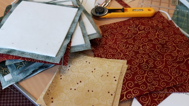 Our first job was to cut everything out and prepare everything, this seemed to take most of the morning…twelve 7″squares in the red and green fabric, twelve 5″ squares of cream fabric, with Bondaweb already applied, twelve squares of bosal.