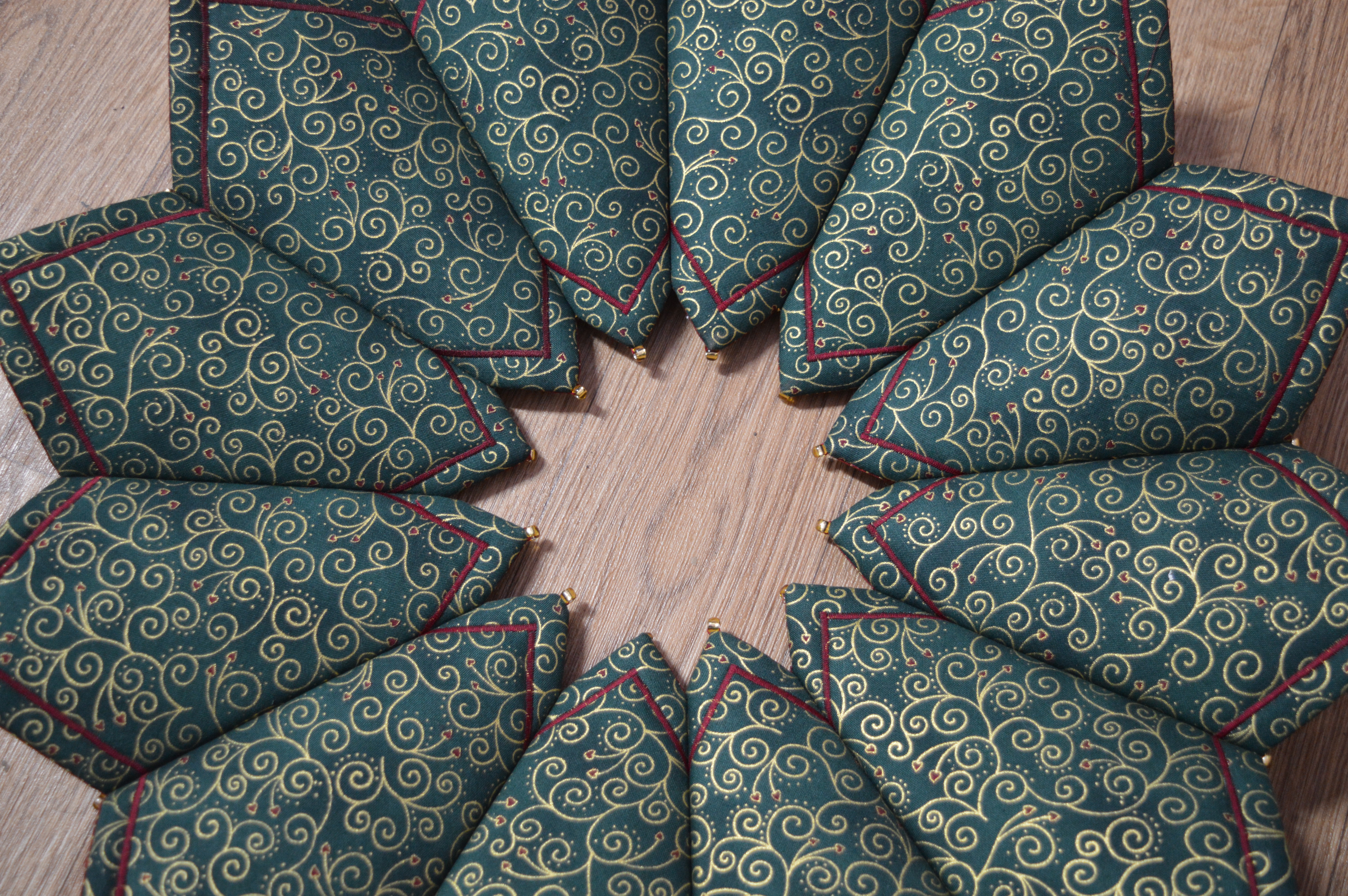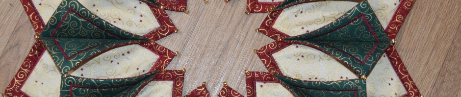 These wreaths we not half as complicated as I thought to make, just in case you’re still trying to get your head round the design, the green is the bottom square which curls up to the front. The red is the top square, it isn’t binding, this is then almost covered by the cream applique square. The stitching round the cream square helps give it structure.