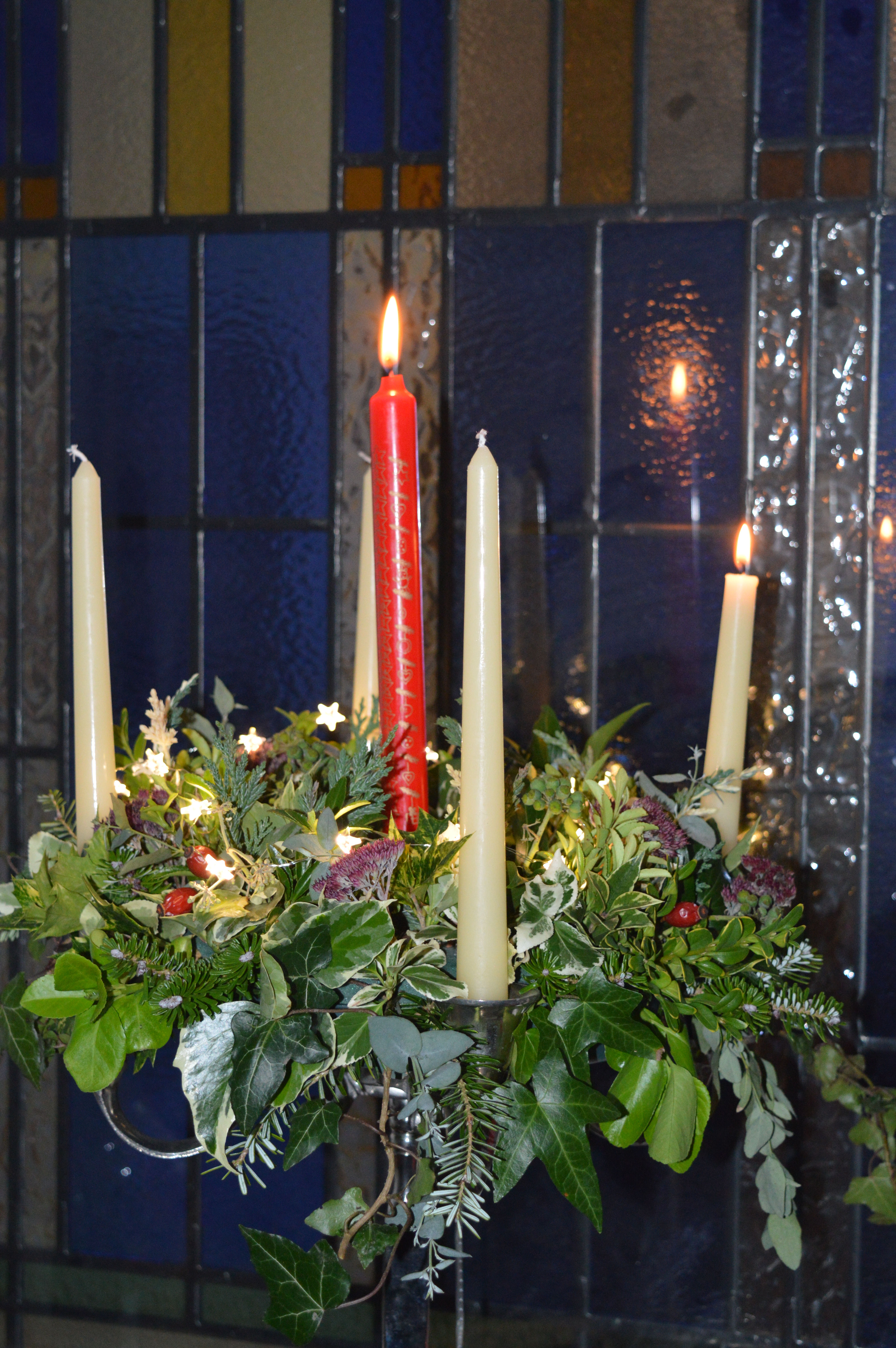 A few years ago I managed to buy a tall candelabra on Otley market, it’s got four arms and a central candle. It’s perfect for my Advent wreath, it’s a bit of a squeeze to get the oasis on, I had to shave a bit off the plastic holder this time! I use the central older for my Advent candle, so I can light it every night in theory…so long as I don’t forget about it on the first night and let it burn down to 6!!
