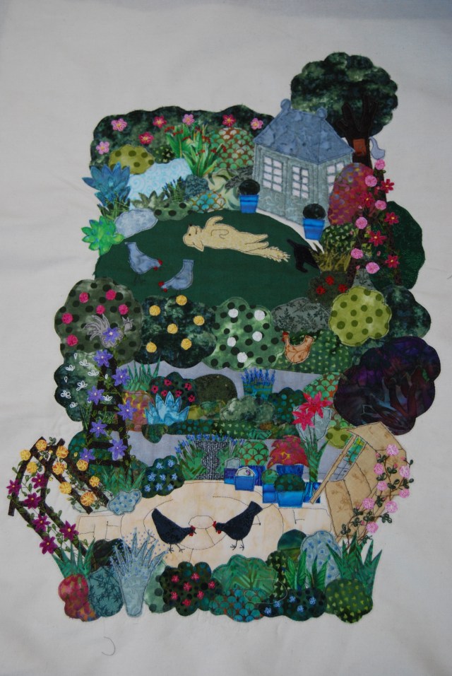 …and this is our garden. I started this at a workshop by Janet Browne back in 2014, she’s a local textile artist who makes amazing pictorial maps and pictures using what I would call reverse applique, she machine stitches from the back over a design drawn on paper. I came home and finished it with Bondaweb – I know my limitations! It’s a fairly accurate representation of our garden at that time, including our two dogs and five chickens!