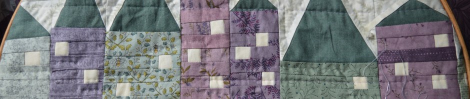 Well I’m still quilting the houses but I’m about three quarters round. My quilting here isn’t the neatest as I’m finding all the layers involved with foundation paper piecing a bit tricky to get through. I’m stitching a quarter inch out from the roofs and also a zig-zag sort of line through the row of houses, going up and down round some of the windows. It doesn’t look much but even this border is nearly a metre square. I’m thinking of stitching rays of sunshine from the sunflower and then this border will be finished.