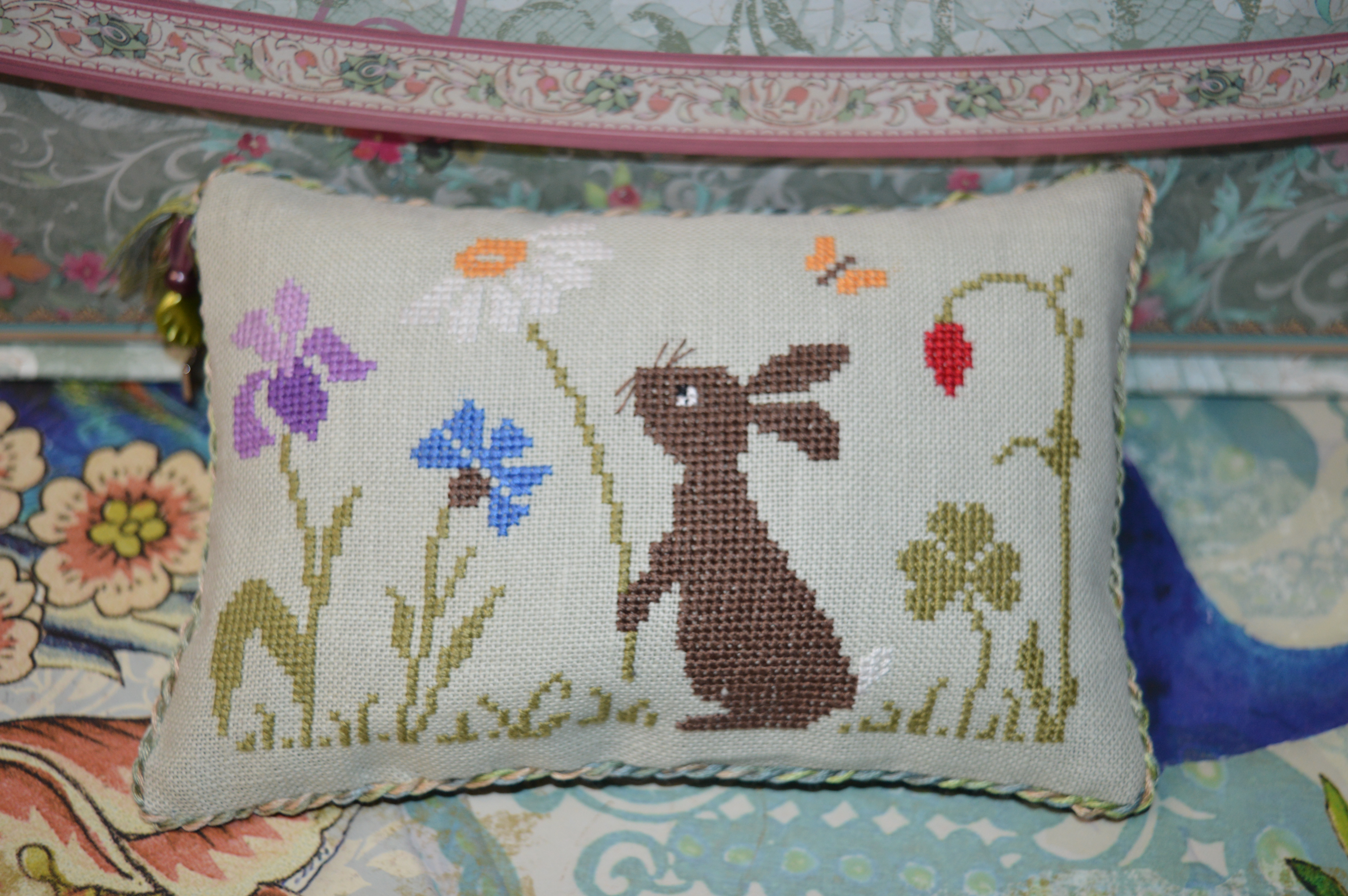 The cute rabbit is one of this years finishes, it’s a design by Dany Chevallier, there’s another one I want to do with a rabbit and a daffodil too. This one was on display for April as well, Easter Bunny and all that. I’ve included it again as I love seeing rabbits hopping about the fields and the verges so it was very sad on our walk over the moors this week to see that myxomatosis is clearly raising it’s ugly head again.
