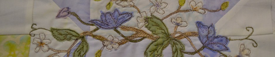 The second swag is smaller, with just clematis and blossom to stitch. It didn’t take too long to put together and stitch. This one lies just above the squirrel and the owl, at the top of the quilt.