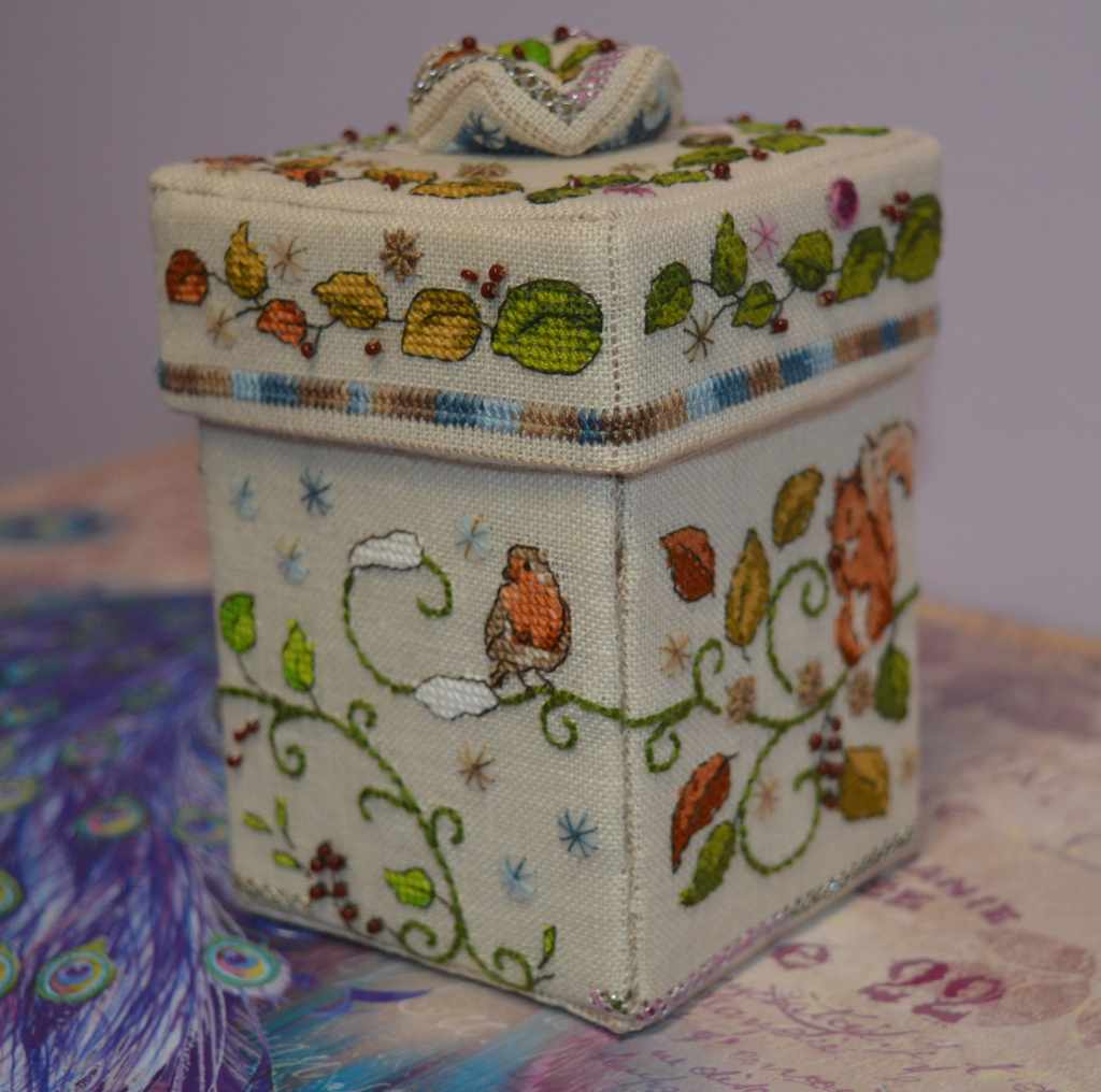 I seem to have lots of summery ones, and Easter or Christmas ones, not so much for the gloomy months like January so it’s a bit of a mixed bag!! I’ve turned my two seasonal boxes round to winter, one is an etui by Betsy Morgan, the other is my most recent finish by Faby Reilly, the gorgeous Zoe Box, showing the cute robin at the moment.