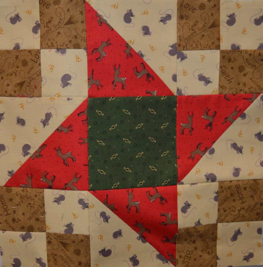 We started in February and Tracy was the first lucky recipient, her colours were Christmassy, reds. greens and pudding browns. I found some cute Christmas fabrics on line and chose three blocks out of a book I picked up somewhere – it’s called A block a Day – 365 blocks, one for every day of the year! This one was my first one…
