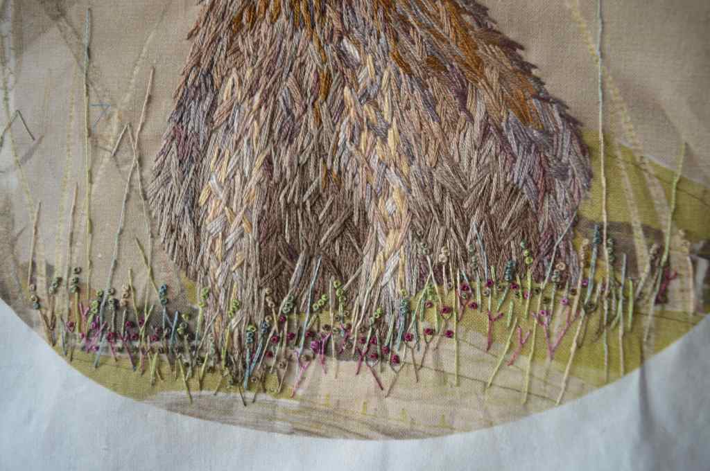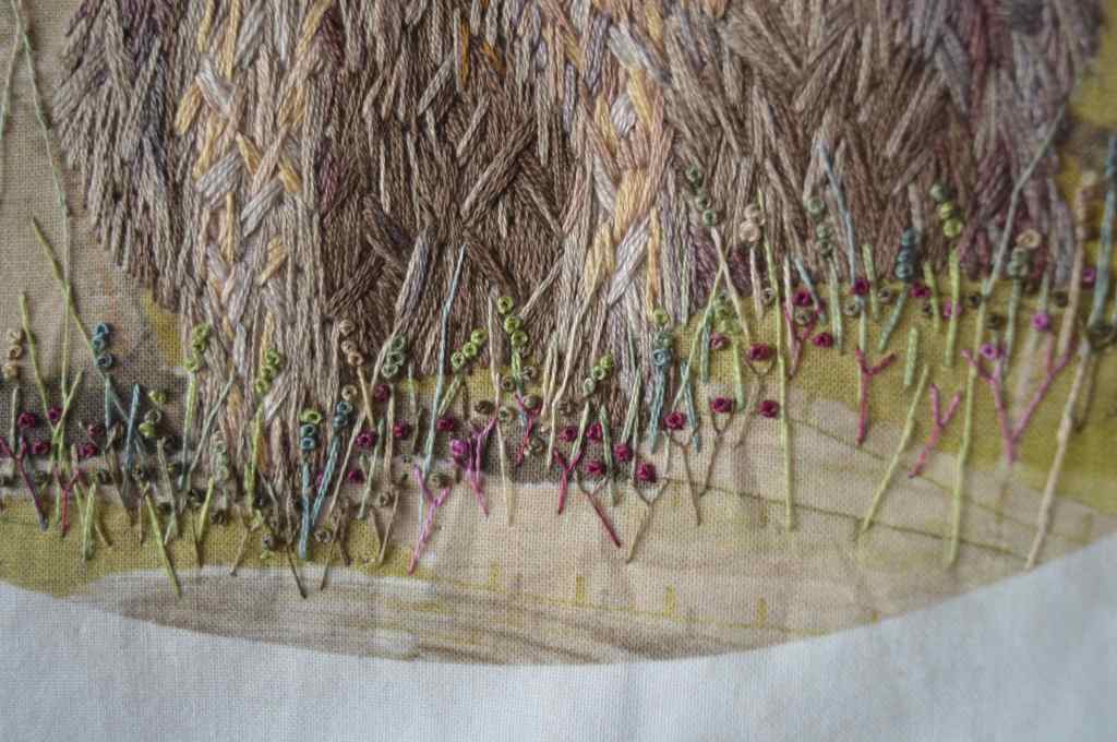 The fore ground was more complicated to work out. I wanted to stitch enough to ground him, without taking over. I started off by using a single thread of DMC variegated floss to stitch the long grasses. I ignored the think grasses in the picture, but you can just about see the finer lines which I stitched over with stem-stitch.