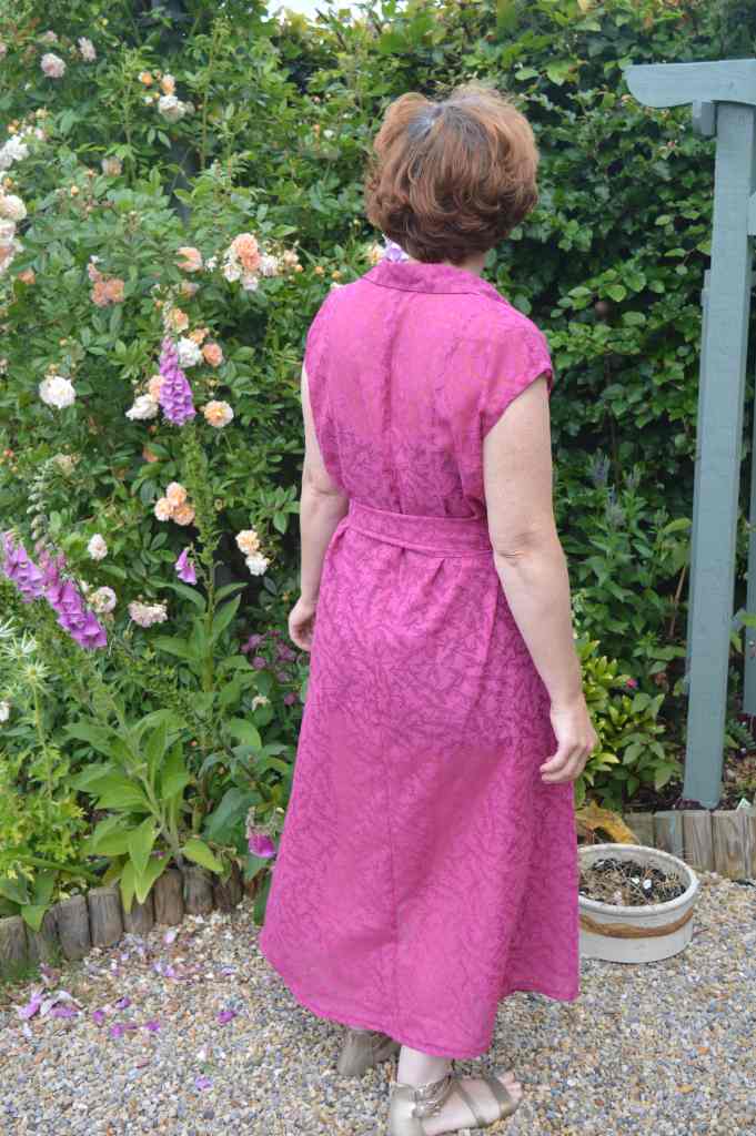 This time I made the pink up, as you can see it’s very pink, what I would call raspberry pink and the pattern etched out is a multitude of dragonflies. These fabrics are not as sheer to wear as you would think, you can see the top area with my arm behind really isn’t that see through, though with a bit of light behind it’s a different matter! Having said that, I do need to make an underskirt of some kind to wear for a bit of modesty!