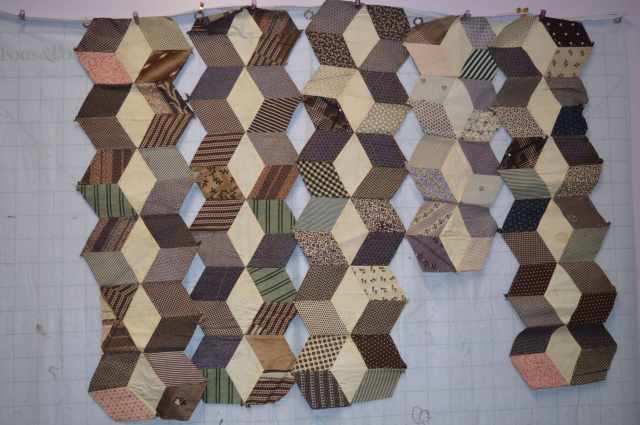 I haven’t got very far with my antique quilt, but I have made a start. This is an unfinished quilt which my daughter found when clearing her grandmother’s house. It’s a tumbling blocks pattern and from what we can deduce from the backing papers, it’s from around 1880!