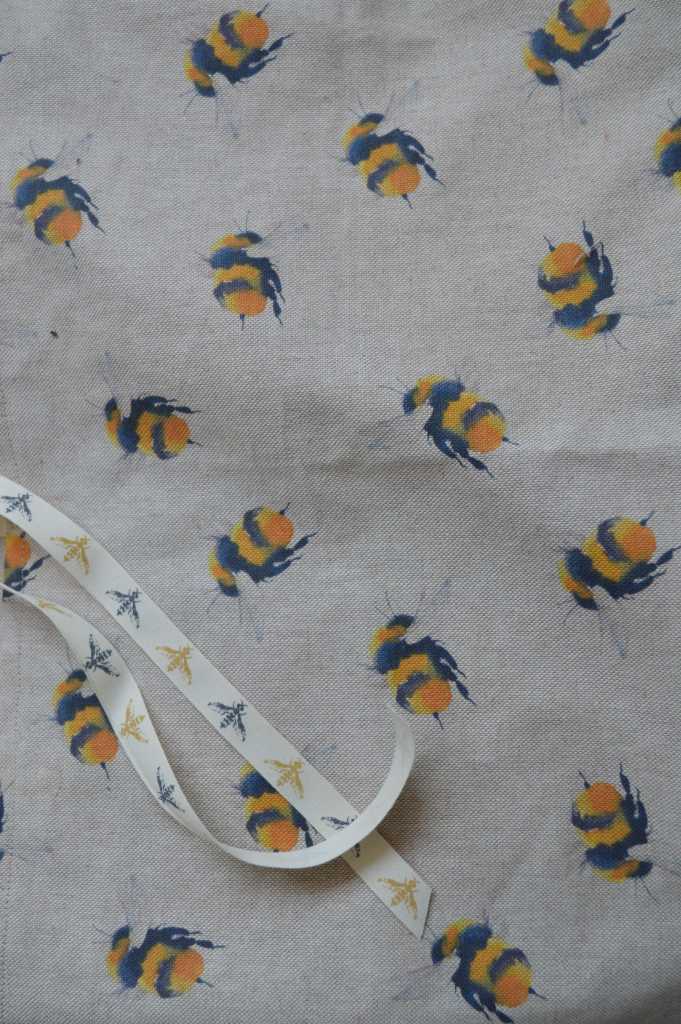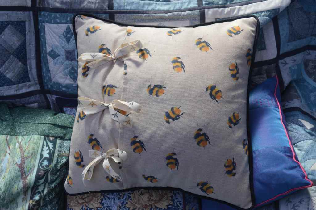 If I’m making cushions for myself, I often don’t put an opening in such as buttons or a zip, I just stitch it up and if it needs cleaning I unstitch it again. However as this was a gift I thought I ought to do it properly! I cut the backing piece in half so it would overlap, finnished the edges and then stitched the front and back together. I found some bee tape in my stash which worked really well for ties, I even managed to alternate the colour of bees across the three pairs of ties.