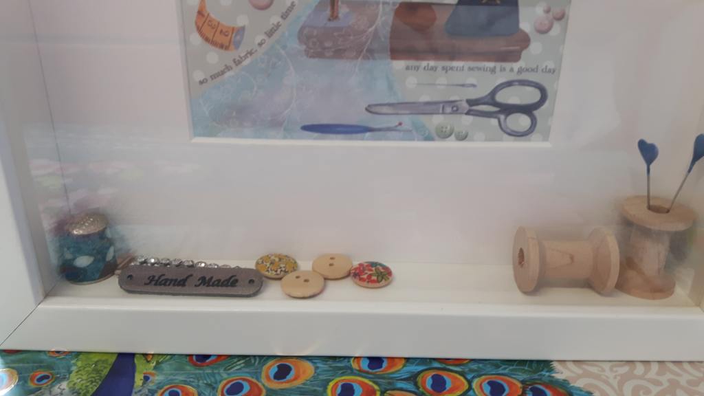 Of course when I’m moving everything round, emptying cupboards and drawers I find stuff, get distracted, you know what it’s like! Propped up in the corner I found an Ikea box frame, still in it’s packet, I think my daughter gave me it when she was having a clear out. I realised the aperture was a perfect size for a sewing themed card a good friend had sent me after attending my quilt in a day class. The card had been stood on the windowsill ever since as it’s so pretty. I stuck it in the frame but it needed something else…