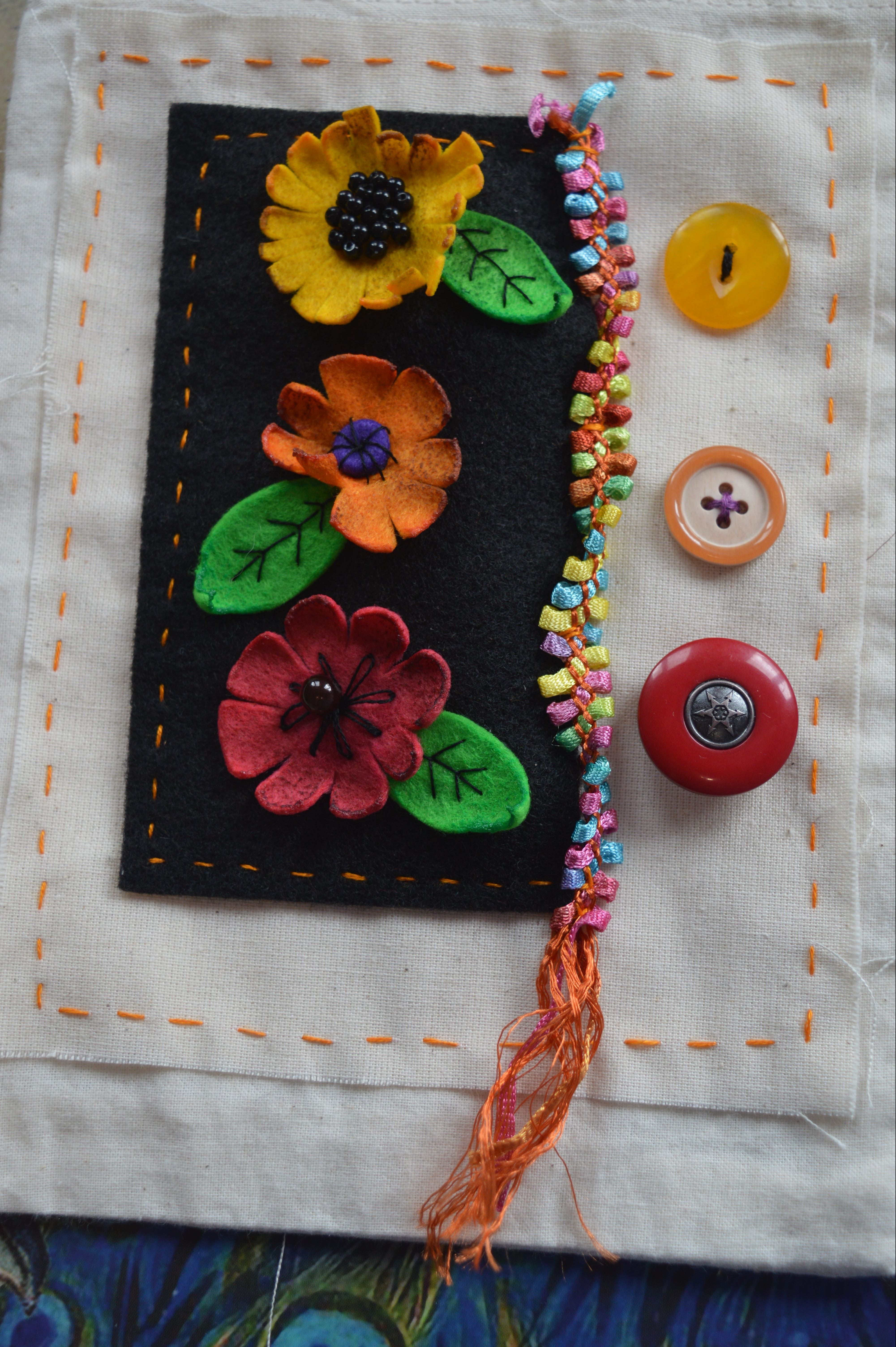 I stitched the red, yellow and oranges flowers onto the black felt with a leaf each, adding dots of kunin felt or beads for the centre. I found the braid in my stash which colour wise matched perfectly. It still needed something else, I rummaged in my button box and found buttons which echoed the flowers in someway…