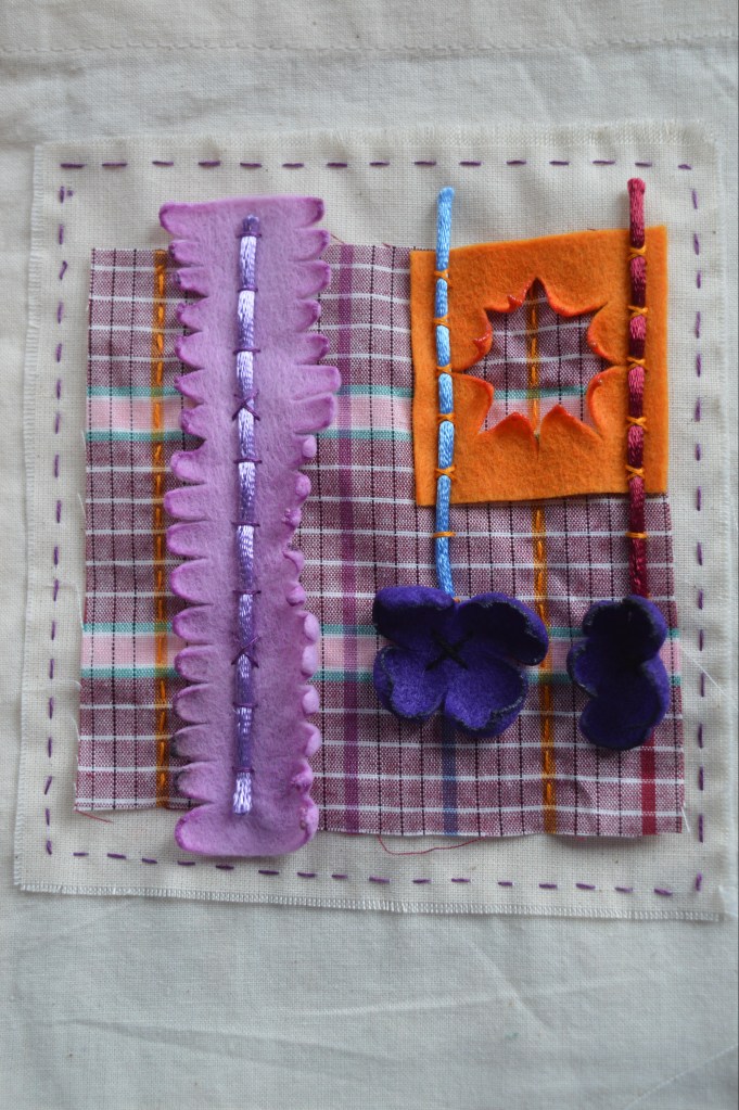 I was left with the strips, purple flowers and holes!! Helen had provide some fabric samples and lengths of coloured cords to help us a long. The fabrics were mainly floral and not purple (!!!) but one was a soft purple check with lines of orange, blue etc. It gave me a starting point…