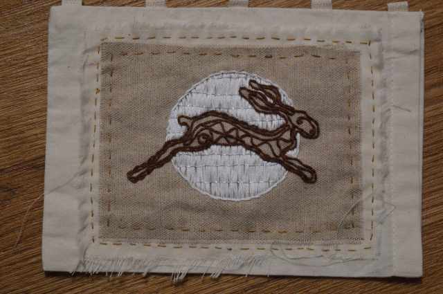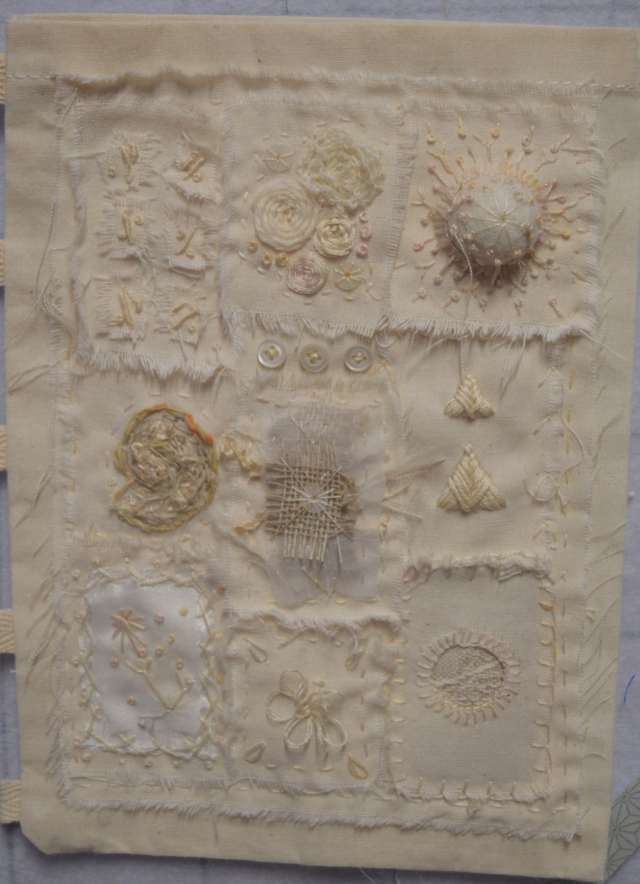 Helen provides calico pages to stitch the samples on which have five little tabs down one side for binding, it’s a lovely technique, I watched her video on how to do it, but first I needed to make covers and add something for the front and back page – I’d stitched my samples in so they were opposite each other.